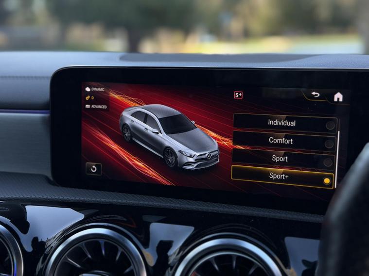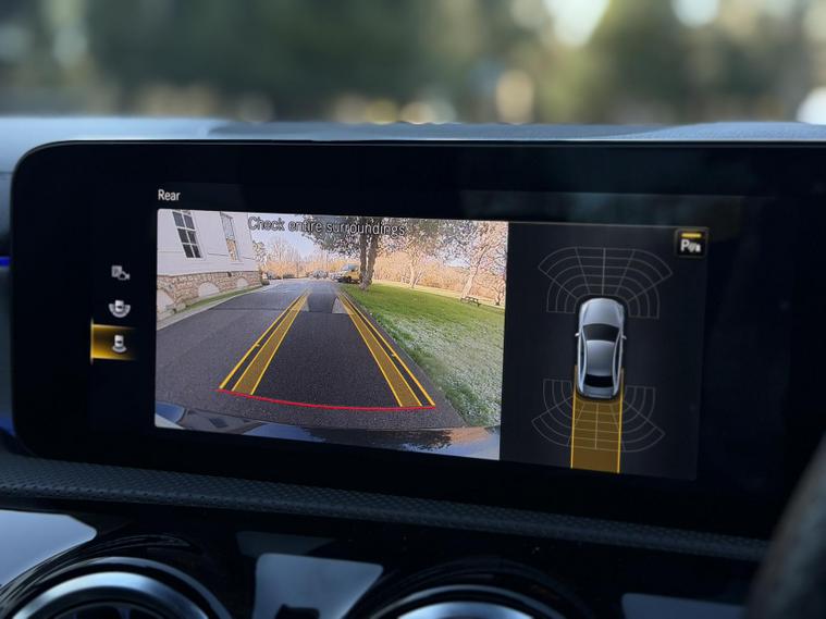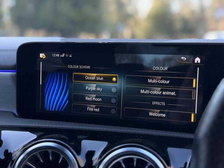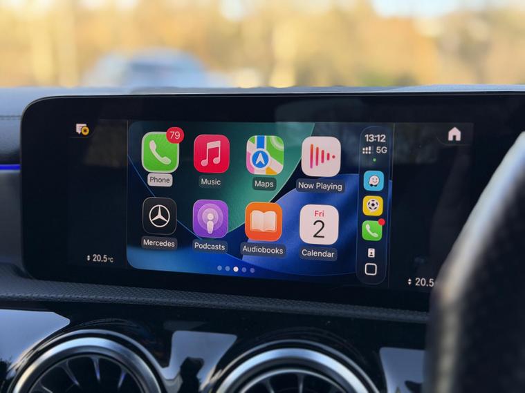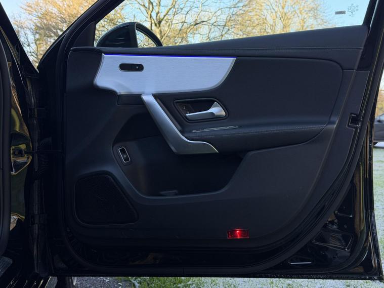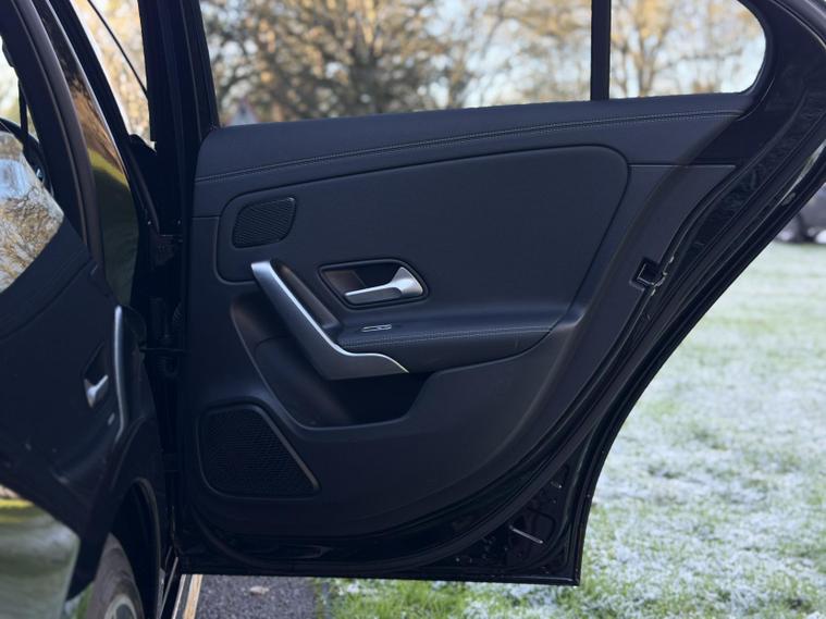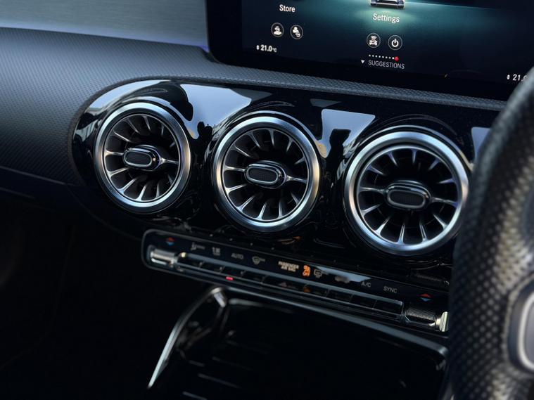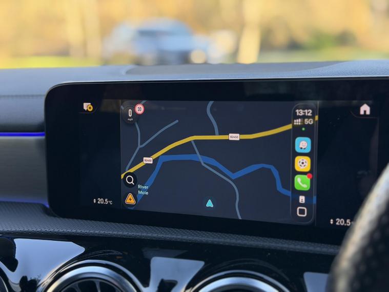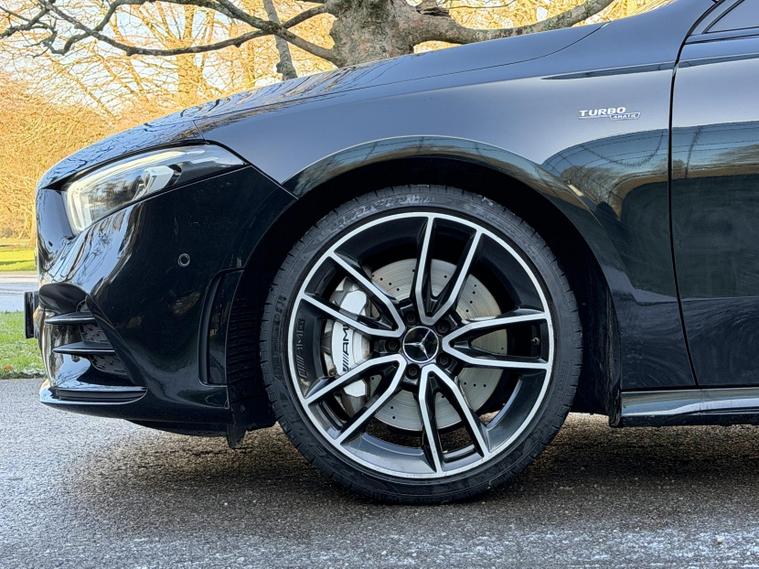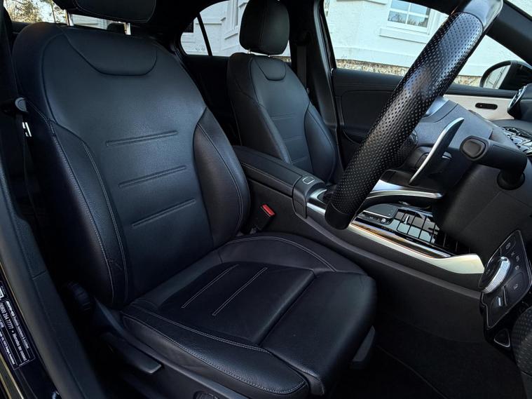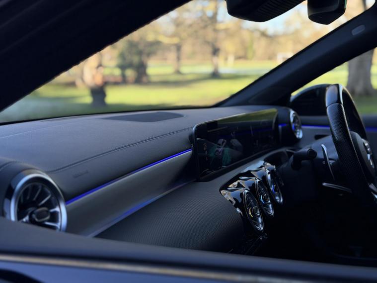 Finished in optional Cosmos Black metallic with black leather interior. Premium specification includes 10.25-inch MBUX multimedia system with hard-disk navigation, Apple CarPlay, live traffic and augmented reality navigation, Mercedes-Me remote services, wireless charging, multiple USB-C ports and Mercedes-Benz 225-watt sound system. AMG styling includes 19-inch AMG alloys, AMG Night Package, AMG sports exhaust with exhaust flap, LED High Performance headlamps and widened AMG wheel arches. Heated AMG sports seats, dual-zone climate control, digital instrument display and comprehensive driver assistance systems complete the package.