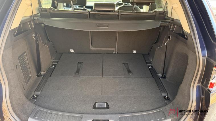 Specification highlights include Terrain Response with All Terrain Progress Control, front and rear parking sensors, automatic headlights and rain-sensing wipers, approach lights, front fog lights, heated windscreen, heated front seats, privacy glass, powered tailgate, keyless start, satellite navigation, DAB digital radio, Bluetooth hands-free and audio streaming, InControl Protect, cruise control, lane departure warning with run-off road warning, intelligent emergency braking, ambient interior lighting, Ebony partial leather interior with leather/suede seats, leather multifunction steering wheel, electric heated folding mirrors, dual-zone climate control, TFT driver display, traffic message channel, tyre pressure monitoring system, alarm system. Practical touches include a flat load area, split-fold sliding second row, and a power socket in the rear, making this a versatile and usable SUV.