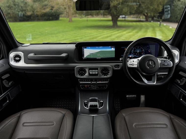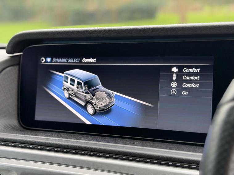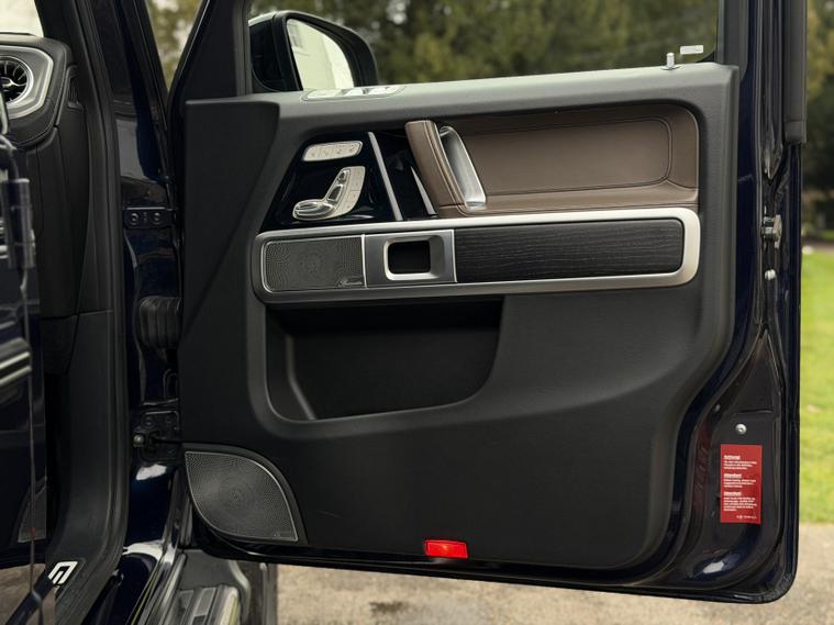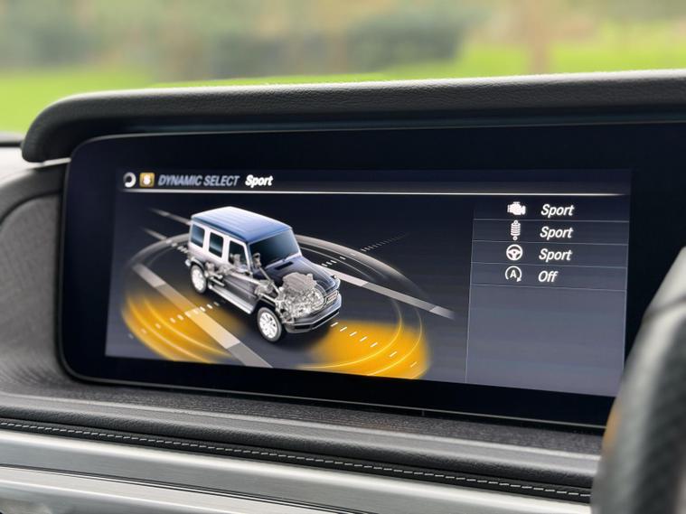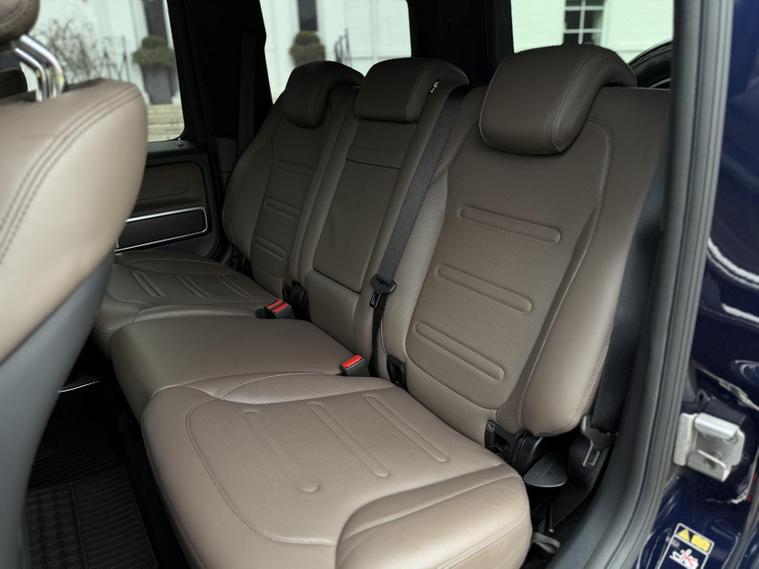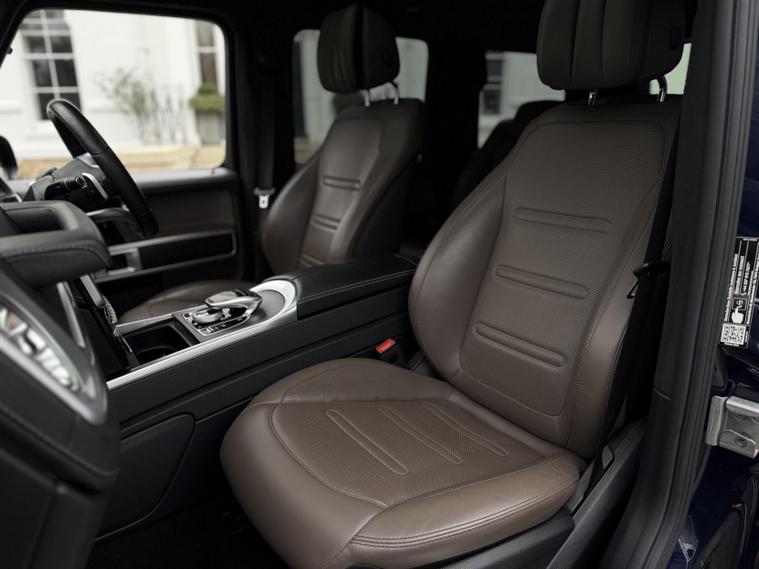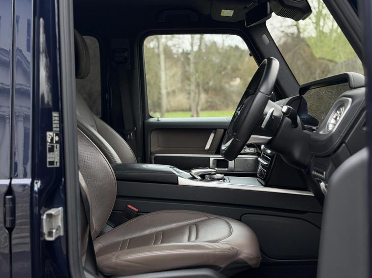 This example is specified as AMG Line Premium Plus and further enhanced with desirable factory options. The Night Package replaces exterior chrome with gloss black detailing, including darkened grille, trim elements and wheel finishes, giving the car a more purposeful appearance. Cavansite Blue metallic is one of the strongest colours for the G-Class, pairing particularly well with the Exclusive Nappa Leather interior in Macchiato Beige and Espresso Brown, which brings extended leather across the dashboard.