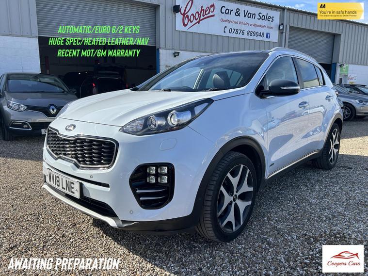 An absolutely cherished example of these fantastic family SUVs. With just one previous owner and this one benefitting from being and automatic, in stunning condition inside and out and has been very well looked after with at least 9 recorded services (all Kia Main Dealer)! These cars are very well known for their excellent build quality and bulletproof reliability. Complete with 2 keys and will be leaving us with a recent MOT and supported by a six month warranty and twelve months breakdown cover. Wonderful specification with GT-Line package including alloy wheels, front and rear parking sensors with self park, rear reversing camera, 2 tone leather interior with heated front seats, sat nav, DAB radio, steering wheel paddle shifters and much much more.