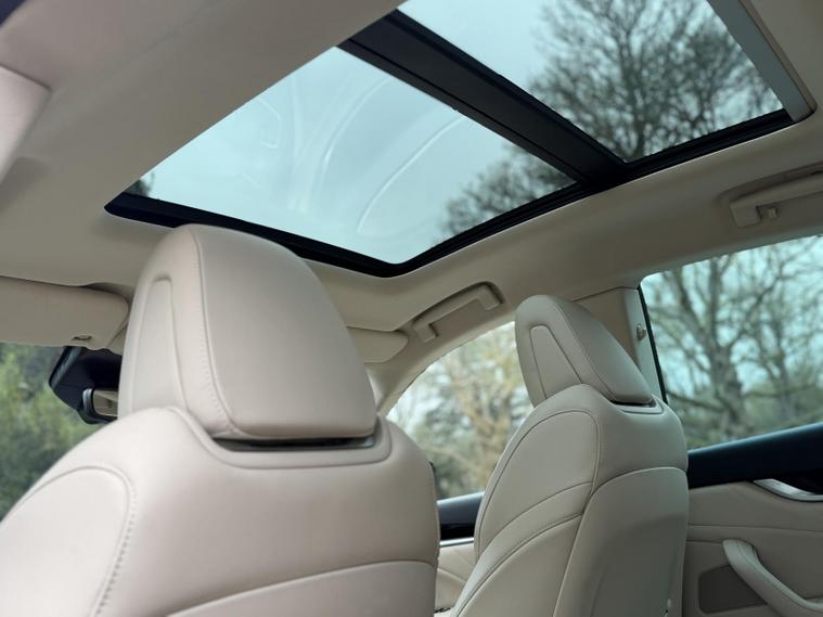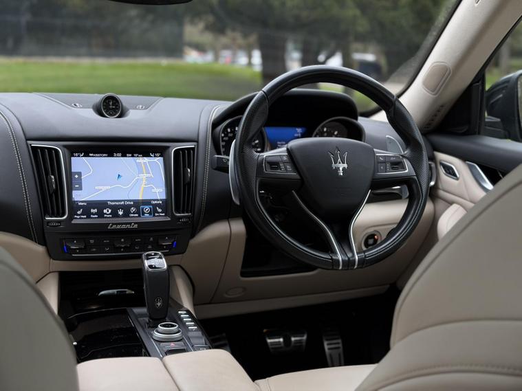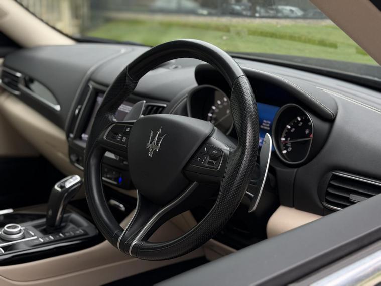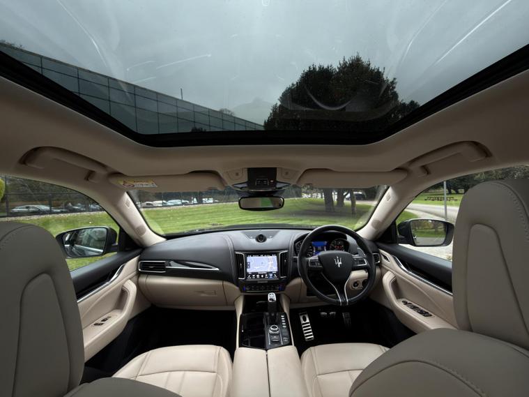 What lifts this car above a standard Levante GranSport is the factory specification. Finished in Nero Ribelle over full Premium Fine Grain Sabbia leather, it has one of the best colour combinations offered on the model. Optional equipment includes the 21-inch Anteo staggered alloy wheels, panoramic sunroof, rear laminated privacy glass, full Matrix LED headlights, Alcantara headlining, heated front seats and rear parking camera. These are the options that materially improve the car, both visually and in daily use, with the Matrix LED headlights and panoramic roof especially sought after, while the Sabbia leather and Alcantara headlining give the cabin a much more expensive feel than the standard interior.