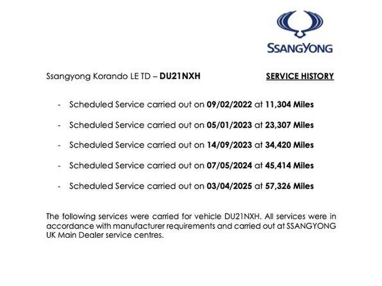 Get ready to elevate your driving experience with this stunning GENUINE 1 OWNER SsangYong Korando 2.2D LE SUV! This remarkable vehicle combines style, performance, and practicality, making it the perfect choice for those who crave adventure without compromising on comfort. With a powerful 2.2-litre diesel engine delivering 176 bhp and an impressive torque of 295 lbs/ft, you’ll enjoy a thrilling ride that accelerates from 0 to 60 mph in just 9.9 seconds. Whether you're navigating city streets or exploring the great outdoors, this SUV is designed to meet all your needs.