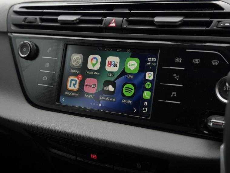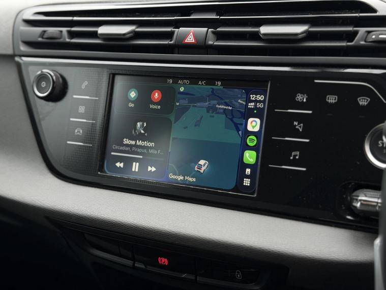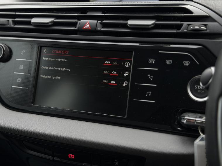 Standard equipment includes the 12 inch HD panoramic central display combined with a 7 inch Touch Drive interface, Citroen Connect navigation, Apple CarPlay and Android Auto mirror screen, Bluetooth media streaming, DAB radio and USB connectivity. Driver assistance includes rear parking sensors, programmable cruise control with speed limiter, tyre pressure monitoring, coffee break alert and an electronic parking brake.