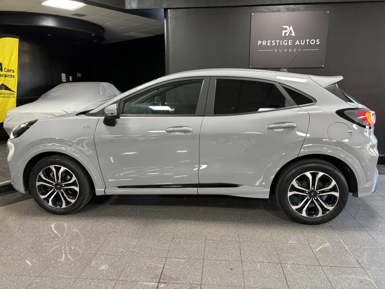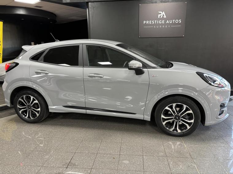 Here for sale at Prestige Autos Surrey, we have this wonderful 2023 Ford Puma 1.0T EcoBoost MHEV ST-Line. Finished in the desirable Grey Matter paintwork, this example also benefits from rear privacy glass and contrasting black ST-Line styling details, giving it a sleek and modern look. Inside, the cabin features a black interior with signature red contrast stitching and sports seats, adding to the premium and sporty feel throughout.