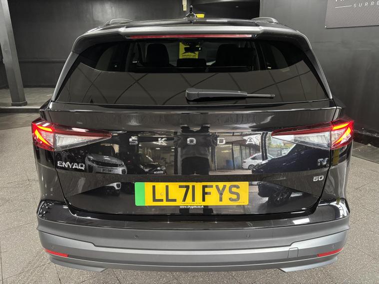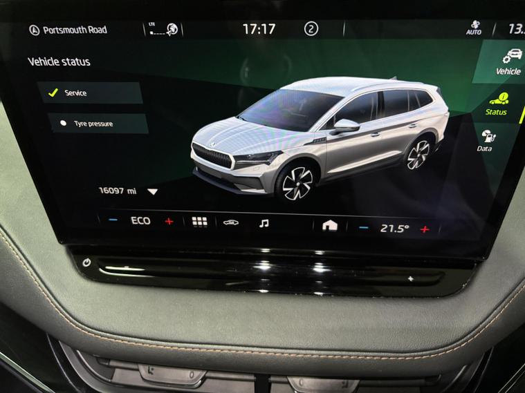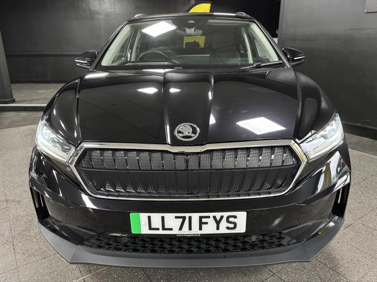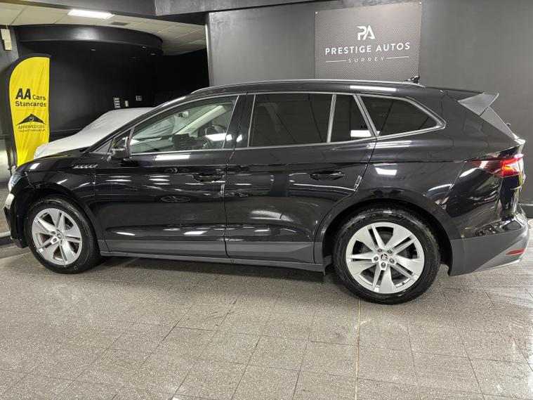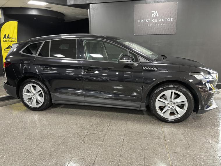 Here for sale at Prestige Autos Surrey, we have this wonderful 2021 Skoda Enyaq iV 62kWh 60 SUV. This specific example comes in Skoda’s desirable “Black Magic”. This Škoda Enyaq iV 60 delivers a refined and quiet all-electric driving experience, with strong everyday usability thanks to its smooth automatic power delivery and easy home or public charging capability. It offers excellent practicality with a large boot and generous rear passenger space, making it ideal for families or longer trips, while the elevated driving position gives great road visibility.