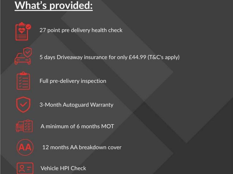 Every vehicle we sell comes with our Customer Care Pack for just £99, giving you extra peace of mind and great value. It includes a 27-point health check, a full pre-delivery inspection, a 3-month in-house warranty, and at least 6 months MOT. You’ll also get 12 months complimentary AA breakdown cover, a full HPI vehicle check, your online V5C logbook, and help with arranging your vehicle tax—so you’re all set from day one. We can also provide 5-day drive-away insurance (T&Cs apply), so you can hit the road without delay. Viewings are available by appointment, and we’re happy to offer virtual viewings via FaceTime or video call if that’s more convenient. We also deliver nationwide, with prices depending on your location. If you have any questions or would like to arrange a viewing, feel free to get in touch—we’re here to help!