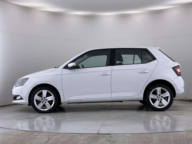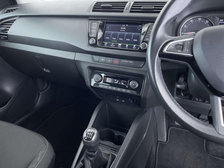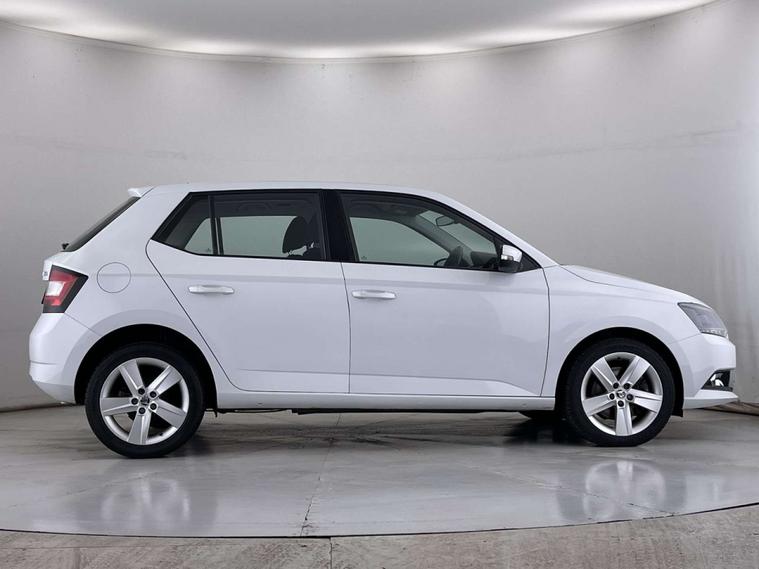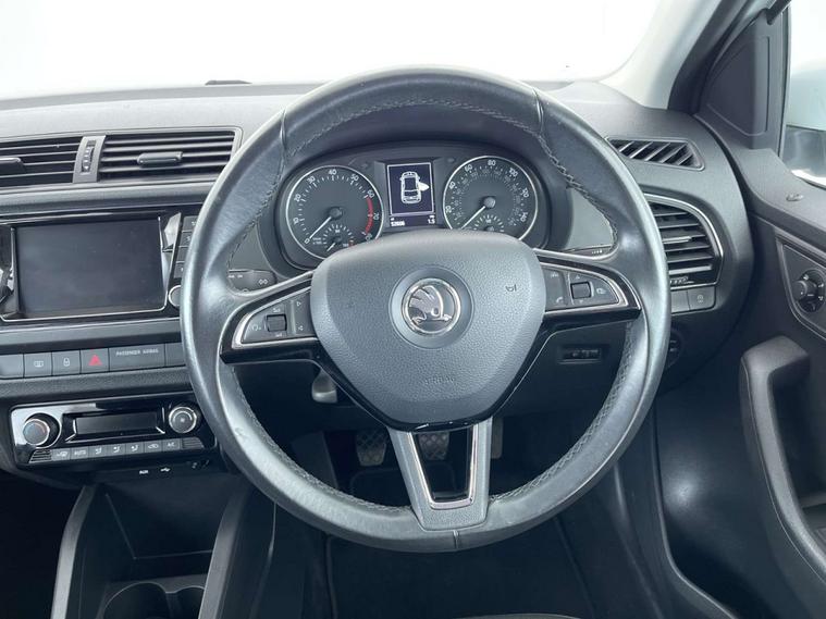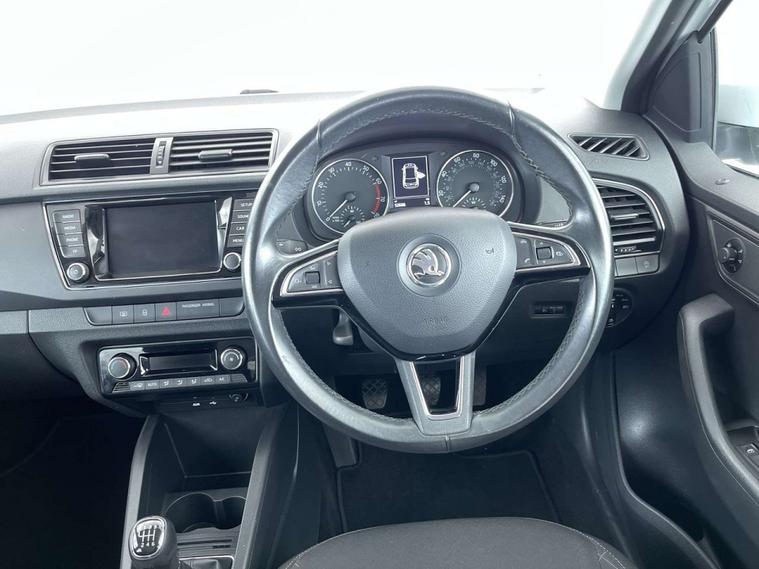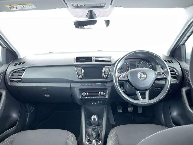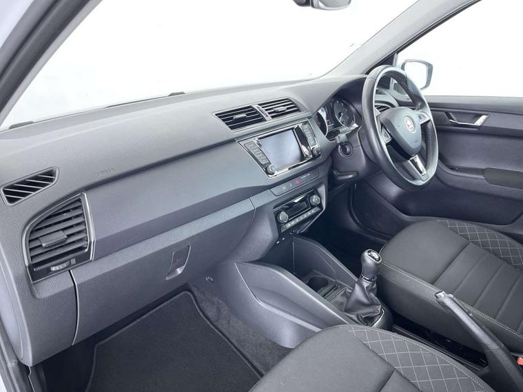 Finished in a sleek White exterior, the Skoda Fabia boasts a modern and sophisticated look. The interior features Onyx/Grey upholstery with a satin black cloth and black dashboard, creating a chic and comfortable driving environment.