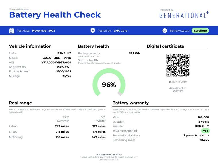 Introducing the Renault Zoe Zoe GT Line+ Rapid Charge EV50 5dr - the perfect blend of style, efficiency, and eco-friendliness. With only 21608 miles on the clock and just 1 previous owner, this electric vehicle is in pristine condition.