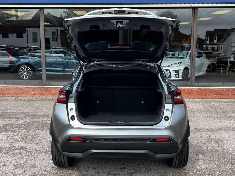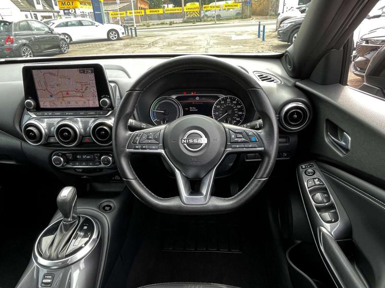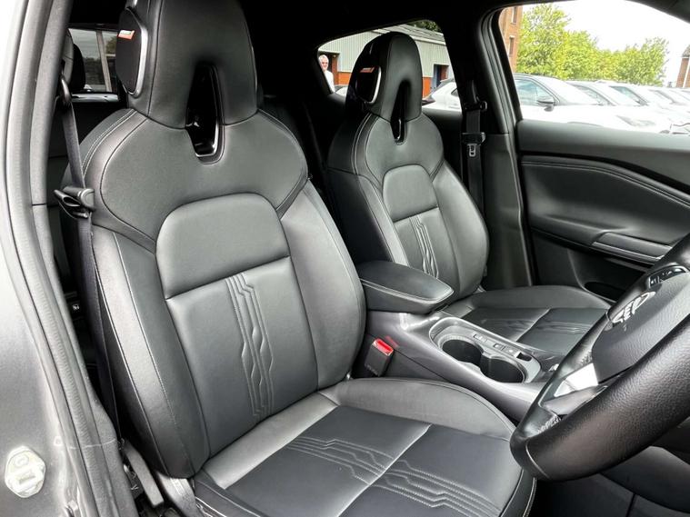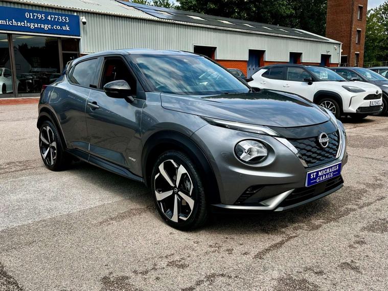 Used 2022 Nissan Juke TEKNA MHEV 1.6L (141 bhp) for sale. Mileage: 26, 535 miles. Transmission: Automatic. Fuel Type: Hybrid. Insurance Group: 14E. Colour: Gun Metallic Grey. Doors: 5. Engine Size: 1.6L. Price: £17, 995. Features include 19" Midnight Black Diamond Cut and Polished Alloy Wheels, 7 inch Touch sensitive Multi functional colour display screen, ABS with EBD and Brake Assist function, Adaptive cruise control, Air Conditioning, Auto dimming rear view mirror, Auto Stop/Start, Auto-headlamps (on/off), Blind Spot Monitoring System (BLIS), Bluetooth Hands free Phone And Media Connectivity, Climate Control, Cruise Control & Speed Limiter, DAB Radio, Drivers Alert System, Eco Drive Mode, Electric mirrors, Electronic Handbrake With Auto Hold, Fog Lights Front and Back, Front and rear electric windows, Intelligent All round View Monitor (360° colour camera), Full Leather, Heated Door Mirrors, Heated Seats, ThermaClear® Heated Windscreen, Hill Start Assist, Isofix child seat anchor points, Keyless Entry, Keyless Start, Lane Departure Warning System, LED daytime running lights, Low speed pre collision assist, Low tyre pressure indicator with rim mounted sensors and on screen pressure display, Metallic Paintwork, Mobile Integration using Apple CarPlay and Android Auto, Nissan D-Mode For Eco/Sport Driving, Parking Camera, Power Fold Electric Mirrors, Privacy Glass (Rear Windows & Tailgate), Rain Sensing Windscreen Wiper, Rear seat with 40/60 split folding, Satellite navigation system with colour, 7 inch display, 3D and voice, maps and traffic information, Selectable driving modes that affect steering and engine mapping, Speed sign recognition system, Sport Drive Mode, Synthetic leather multi-function steering wheel with telescopic adjustment, Touchscreen Media, Traction Control, USB input/charging port, Bose Personal Plus® Audio System, Rear cross-traffic alert, e-Pedal Step, High Beam Assist, LED Front Fog Lamps.