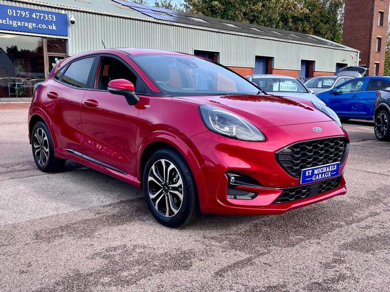 Used 2023 Ford Puma ST-LINE MHEV 1.0L (123 bhp) for sale in Sittingbourne, Kent. Year: 2023 (23), Mileage: 7, 000 miles, Transmission: Manual, Insurance Group: 12E, Colour: RED, Doors: 5, Engine Size: 1.0L, Body Type: Hatchback. Price: £16, 995. This vehicle comes with 2 keys, MOT, full HPI check, professional valet including paintwork care, comprehensive warranty, thorough Pre-Delivery Inspection with any required servicing carried out to manufacturer standards. Features include 17" Midnight Black Diamond Cut and Polished Alloy Wheels, 6 speed gear box, 10.25" digital drivers instrument cluster, 8.0 inch touch sensitive LCD central multi-function display screen, ABS with EBD and Brake Assist function, Air Conditioning, Auto dimming rear view mirror, Auto Stop/Start, Auto-headlamps, Autonomous Parking Pilot, Blind Spot Monitoring System (BLIS), Bluetooth Hands free Phone And Media Connectivity, Climate Control, Cruise Control & Speed Limiter, DAB Radio, Digital Speedometer, Drivers Alert System, Eco Drive Mode, Electric mirrors, Electronic Handbrake With Auto Hold, Fog Lights Front and Back, Ford SYNC Bluetooth media and phone connectivity, Front and rear electric windows, Half Synthetic leather interior, Heated Door Mirrors, Heated Windscreen, Hill Start Assist, Isofix child seat anchor points, keyless Start, Lane Departure Warning System, LED daytime running lights, LED low beam LED high beam headlights with ellipsoidal lenses, Low speed pre collision assist, Low tyre pressure indicator with rim mounted sensors, Metallic Paintwork, Mobile Integration using Apple CarPlay and Android Auto, Mobile Phone Wireless Charging pad, Parking Camera, Power Fold Electric Mirrors, Power-lift tailgate, Privacy Glass (Rear Windows & Tailgate), Rain Sensing Windscreen Wiper, Rear seat with 40/60 split folding, Remote central locking, Satellite navigation system with colour, 8 inch display, touch screen, 3D and voice, maps updated and traffic information, Selectable driving modes that affect steering and engine mapping, Speed sign recognition system, Sport Drive Mode, Synthetic leather multi-function steering wheel with telescopic adjustment, Touchscreen Media, Traction Control, USB input/charging port, Wrong way alert system.