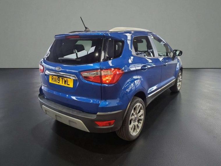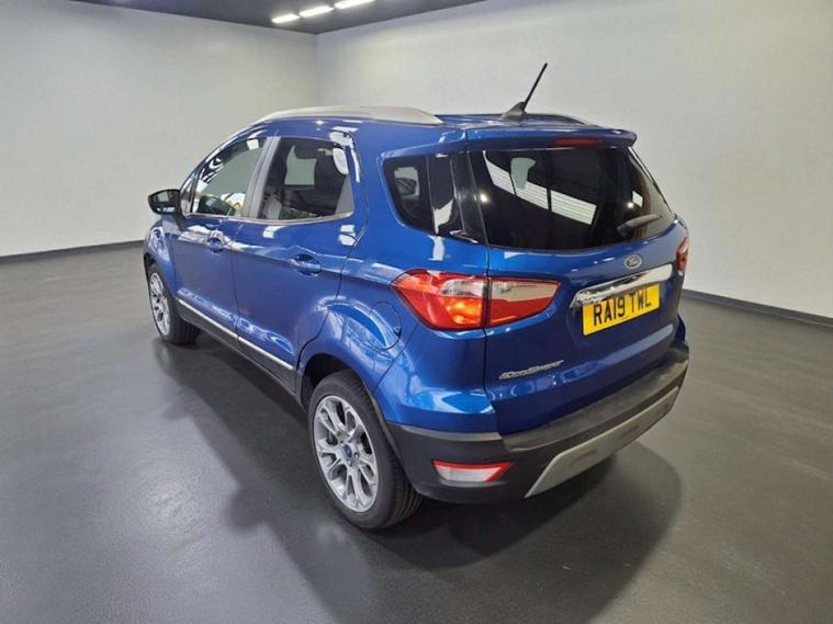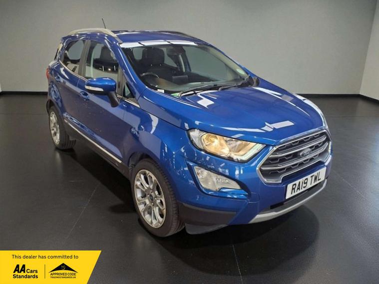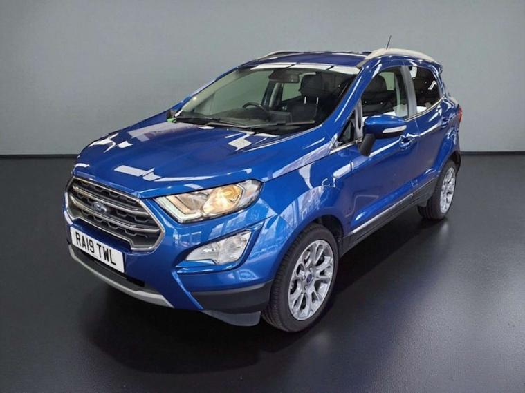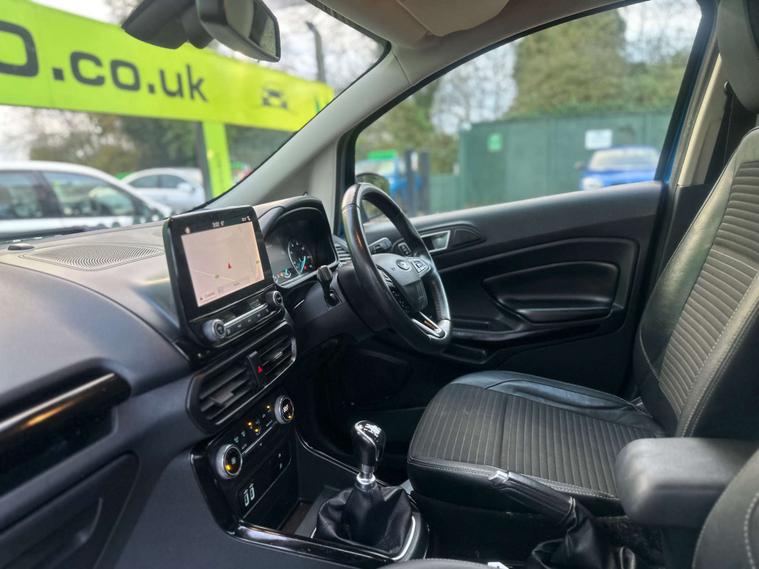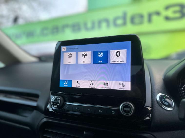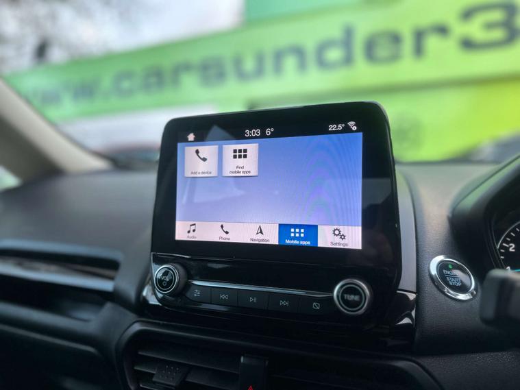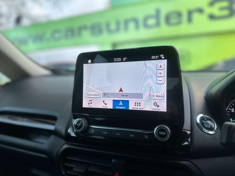 ULEZ / APPLE CARPLAY / AUTO HEADLIGHTS / SERVICE HISTORY / This 2019 Ford EcoSport T Titanium offers a superb blend of style and practicality, making it an excellent choice for your next vehicle. Powered by an efficient 1.0L petrol engine and meeting Euro 6 emissions standards, this model is designed for modern driving. It comes equipped with automatic headlights that switch on when needed, and a rear view camera pack complete with rear sensors to assist with parking. Inside, you'll find the Ford SYNC 3 navigation system featuring an 8 inch touchscreen, compatible with both Android Auto and Apple CarPlay, alongside electronic automatic air conditioning for your comfort.