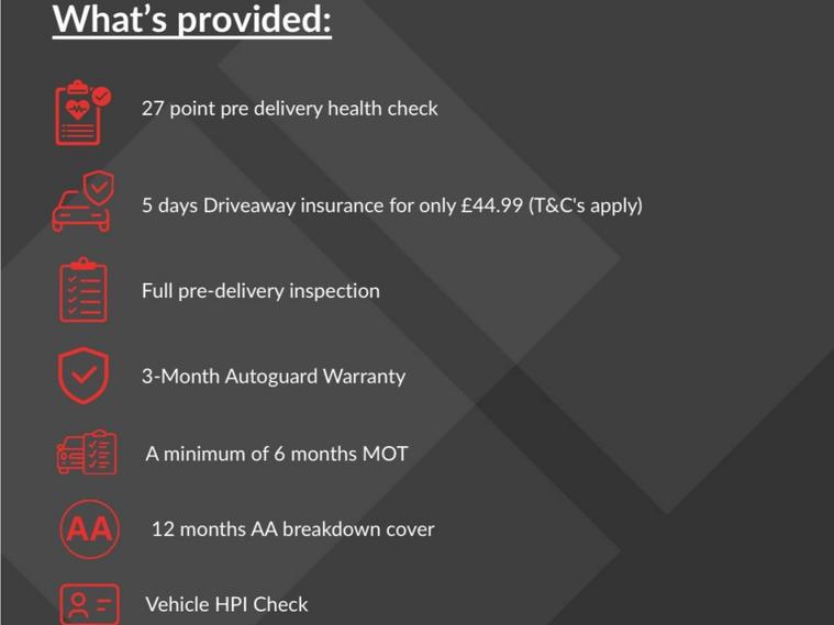Every vehicle we sell comes with our Customer Care Pack for just £99, giving you extra peace of mind and great value. It includes a 27-point health check, a full pre-delivery inspection, a 3-month In-house warranty, and at least 6 months MOT. You’ll also get 12 months complimentary AA breakdown cover, a full HPI vehicle check, your online V5C logbook, and help with arranging your vehicle tax—so you’re all set from day one.