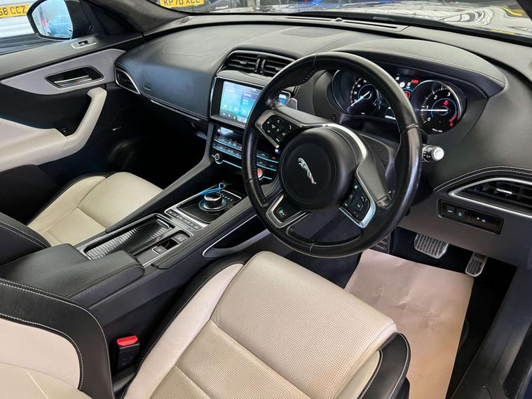 Finished in a striking Loire Blue, the Jaguar F-Pace commands attention with its sleek design and dynamic presence. The 20-inch alloy wheels with a Grey Diamond Turned Finish add a touch of elegance, while the Privacy Glass ensures a sense of exclusivity.