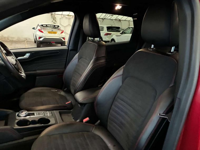 Finished in a striking Lucid Red, the Ford Kuga is sure to turn heads wherever you go. Its bold exterior is perfectly complemented by the Partial Sensico - Rapton Cloth interior in Ebony, accentuated with sophisticated Red Stitching, offering a touch of luxury and comfort.