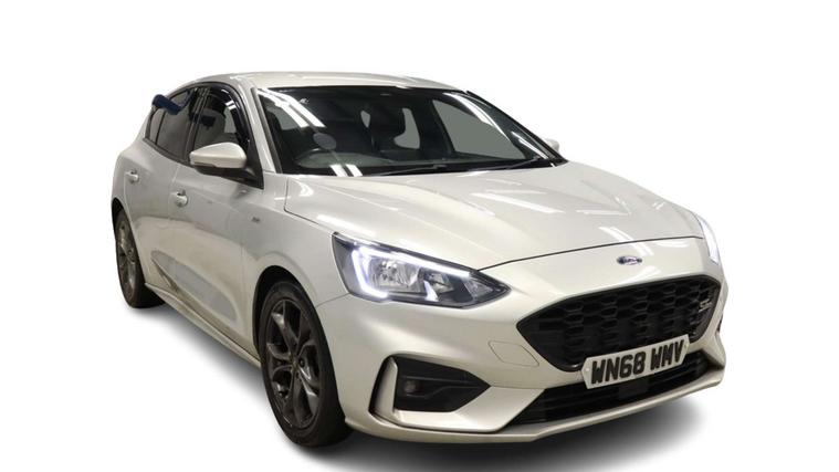 Introducing the Ford Focus 1.5 EcoBlue ST-Line Hatchback in a sleek Silver finish. This dynamic vehicle is the epitome of style and performance, perfect for those who demand both substance and style on the road.