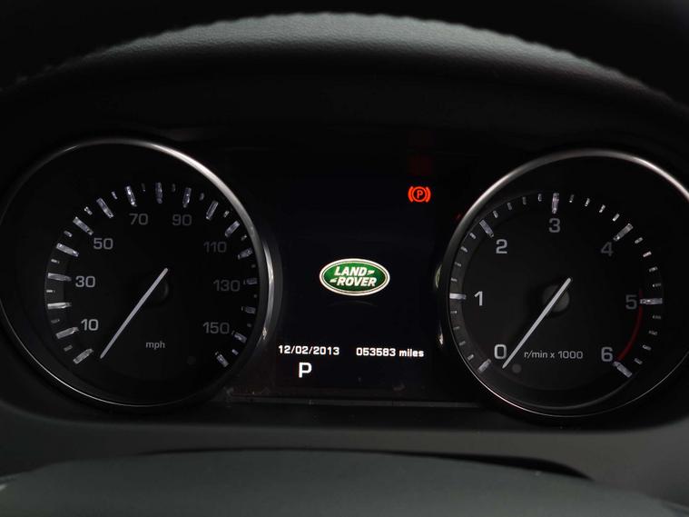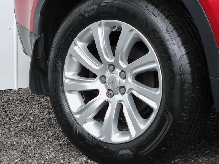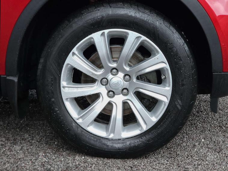 The specification highlights Cruise Control, Front and Rear Parking Aid, Terrain Response, Lane Departure Warning, Winter Pack - Front Heated Seats & Heated Steering Wheel, Digital Audio Broadcast Radio - DAB, Land Rover Audio System, 8in Touchscreen, Navigation System, Reversing Camera Assist, Electrically Adjustable and Heated Exterior Mirrors with Power Folding, 18in Alloy Wheels, Daytime Running Lights, Hill Descent Control & Hill Start Assist.