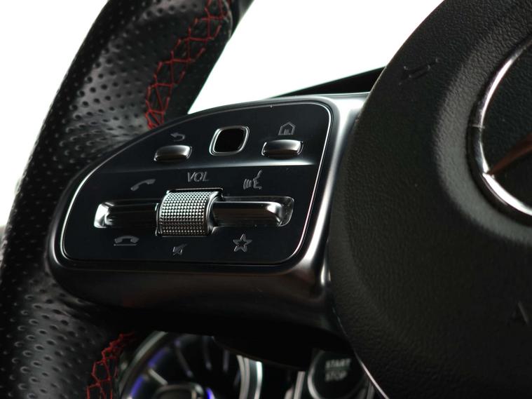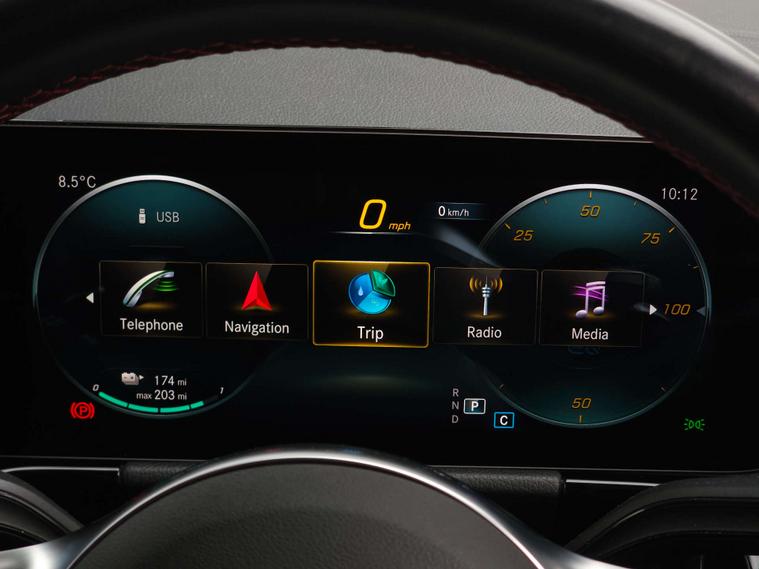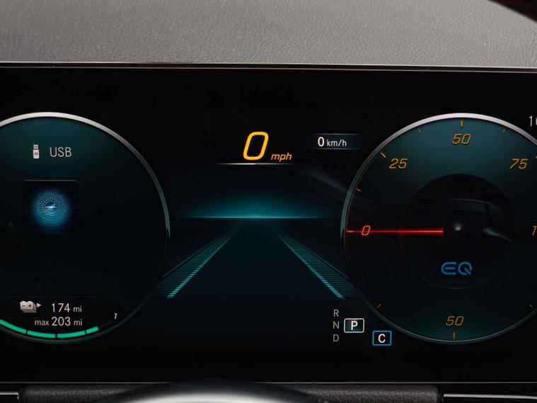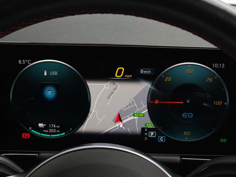 The specification highlights a 262 Miles Range on a Full Charge, Cruise Control, Parking Package with Reversing Camera, Interior Lighting Package with Ambient Lighting - 64 Colours, Dynamic Select, Hard Disk Navigation, DAB Digital Radio, Active Lane Keeping Assist & Speed Limit Assist, Smartphone Integration - Apple CarPlay & Android Auto, 10in Digital Media Display, Front Heated Seats, Mirror Package, AMG Line Bodystyling, Surround Lighting with Projection of Brand Logo, 18in AMG Light 5 Spoke Alloy Wheels, CCS-2 Connector - Combined Charging System - Compatible with AC and DC, LED High Performance Headlights & Adaptive High Beam Assist, EASY-PACK Electric Tailgate, EQ Navigation Services & Seat Comfort Package.
