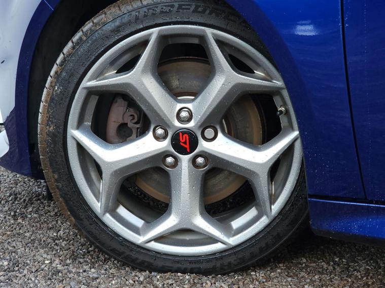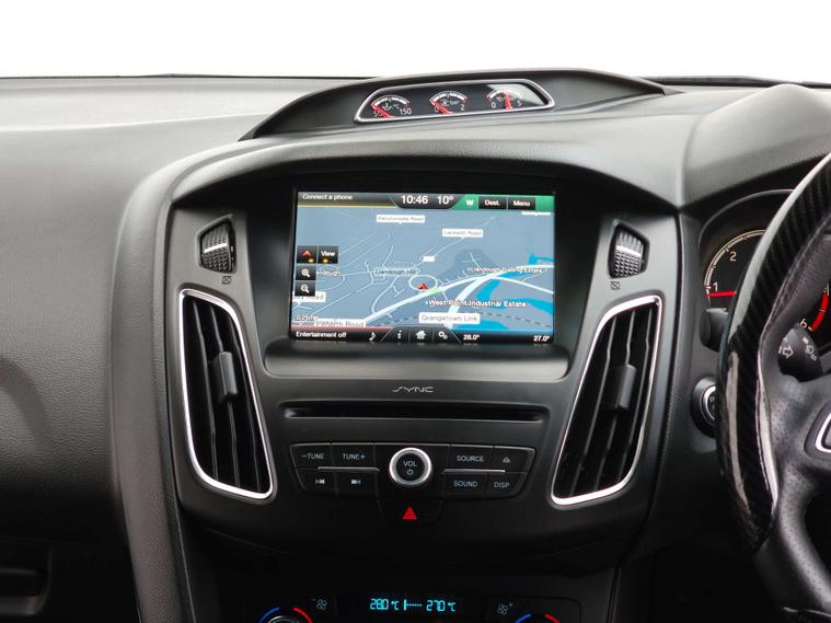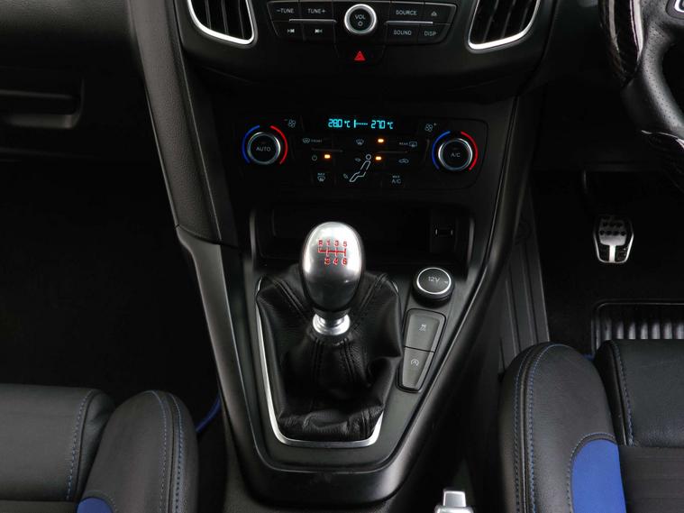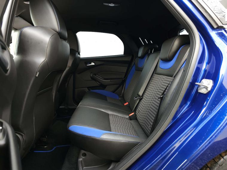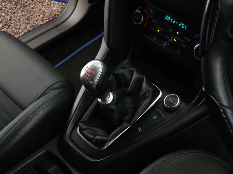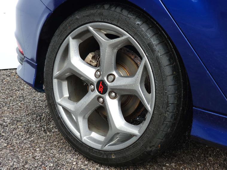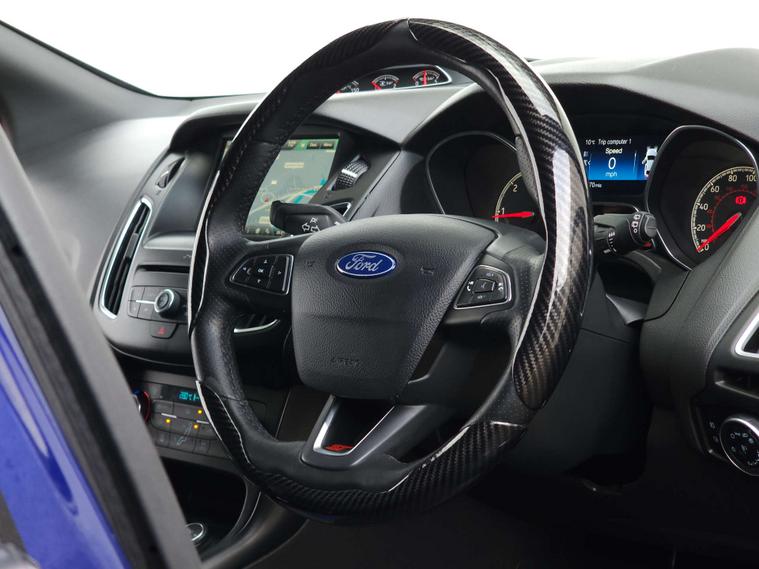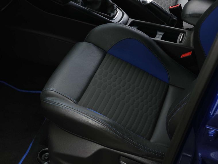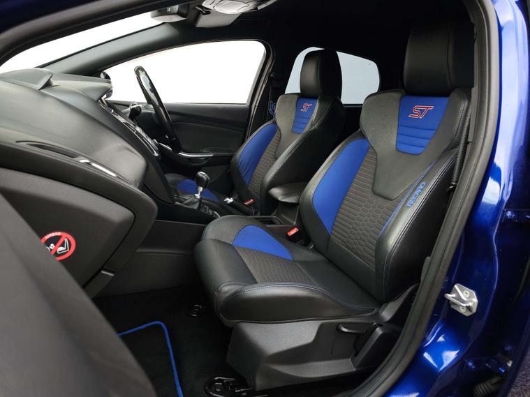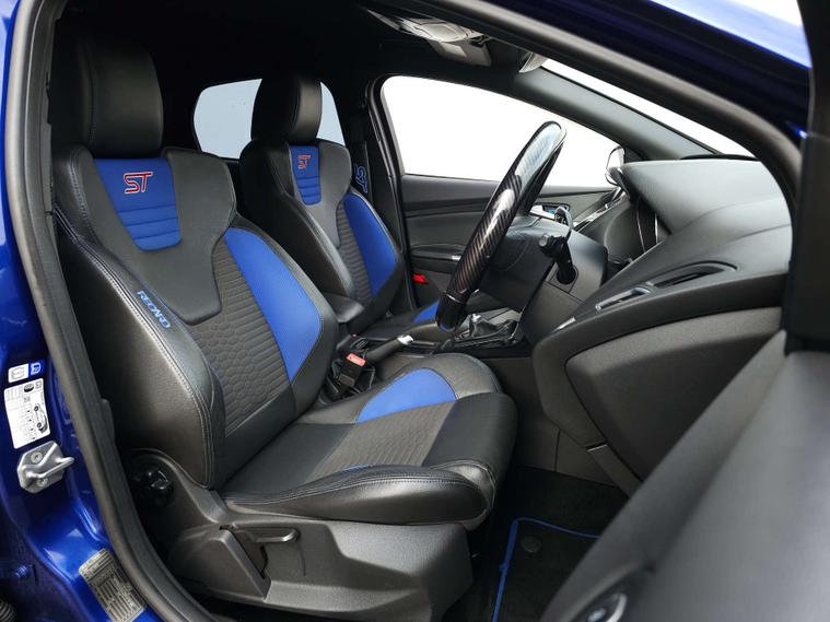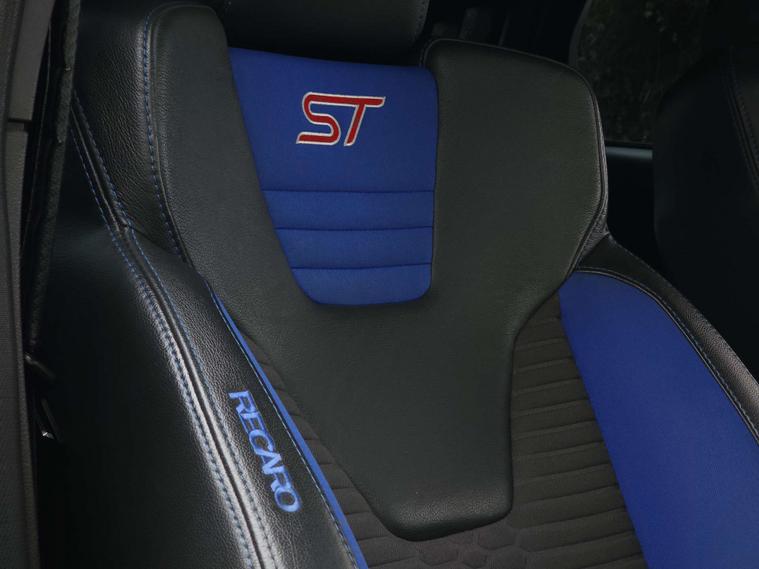 The specification highlights a Ford DAB Audio System, ST Recaro Seats, (Black & Blue), Navigation System, Bluetooth Interface with Audio Streaming, 8in Touchscreen Colour Display, Front and Rear Parking Sensors, 18in Unique ST Alloy Wheels, Electrically Operated and Heated Door Mirrors, MINI Steel Spare Wheel, ST Full Body Styling Kit, LED Daytime Running Lights, Keyless Start, Dual Zone Electronic Automatic Temperature Control Air Conditioning & Hill Start Assist.