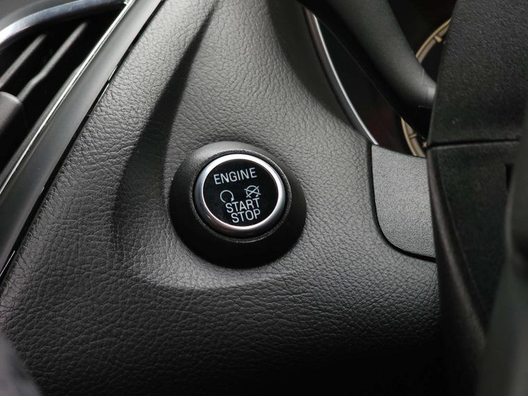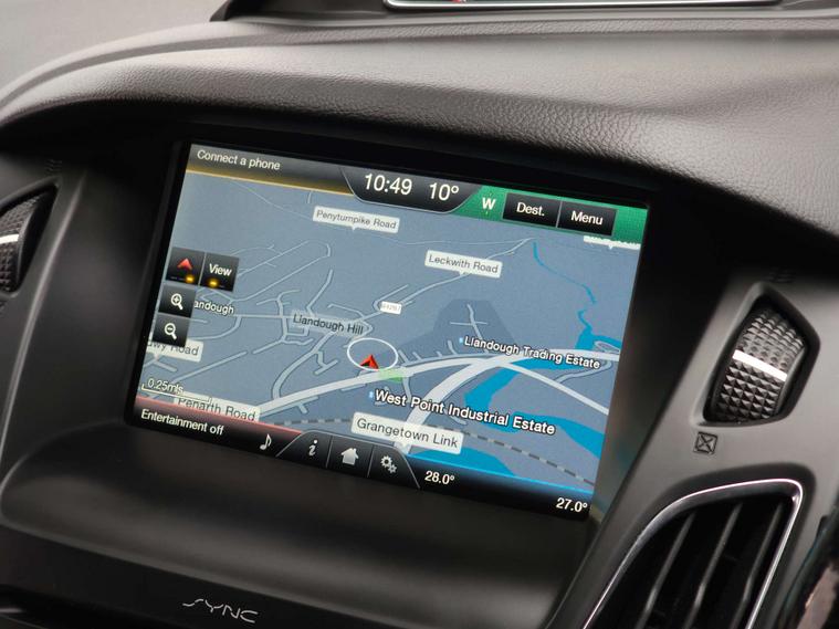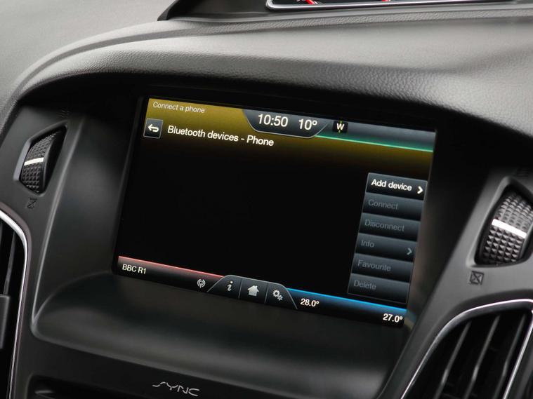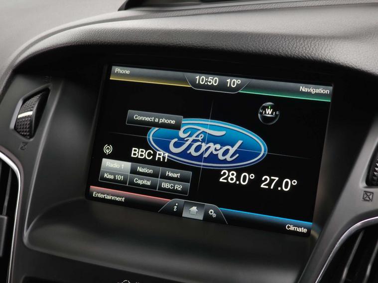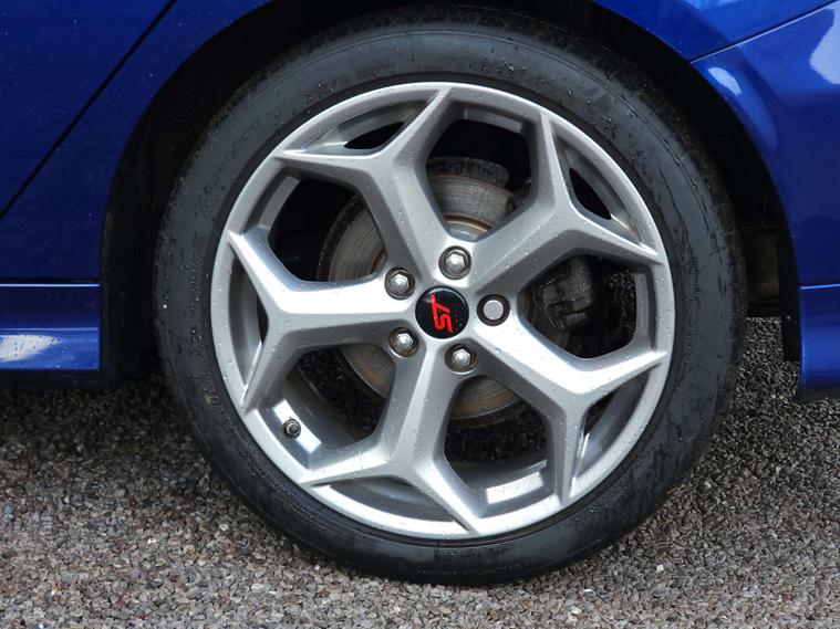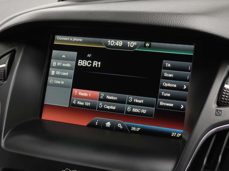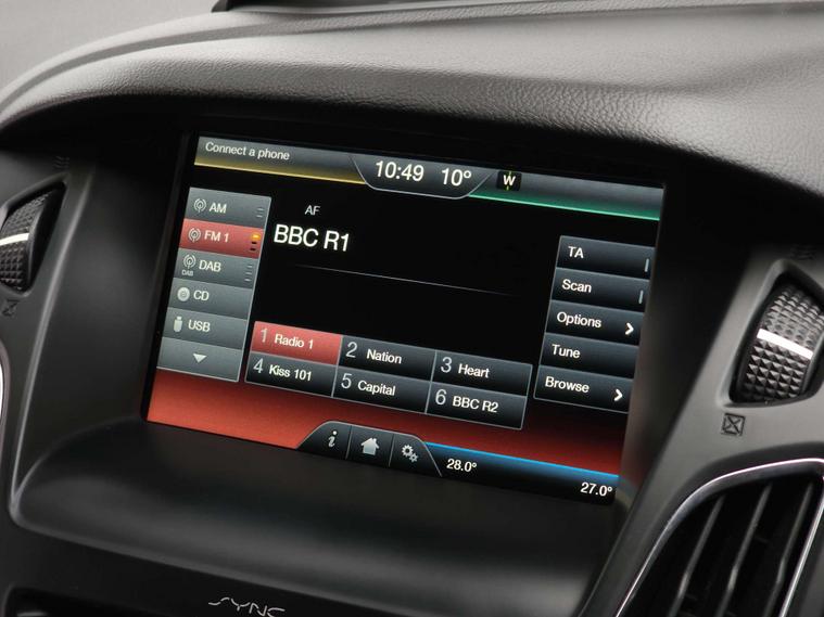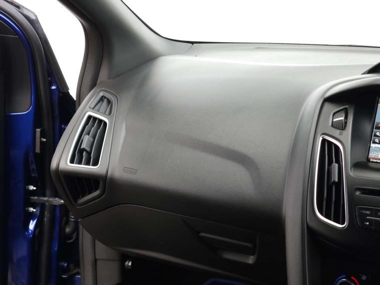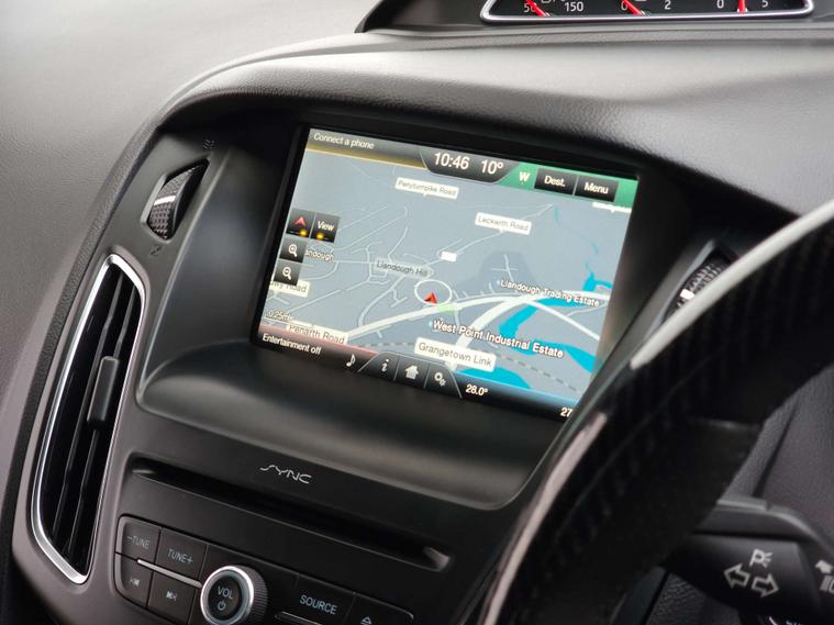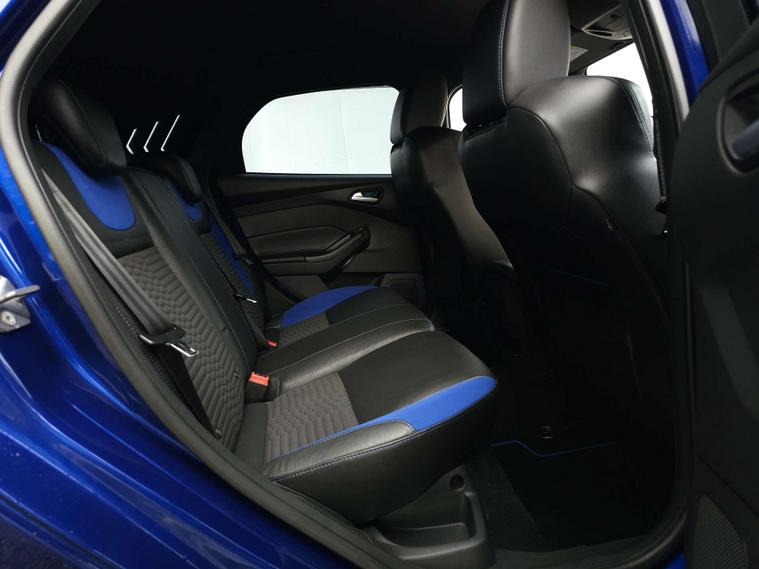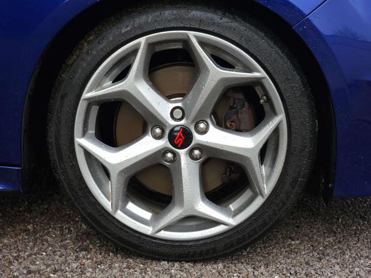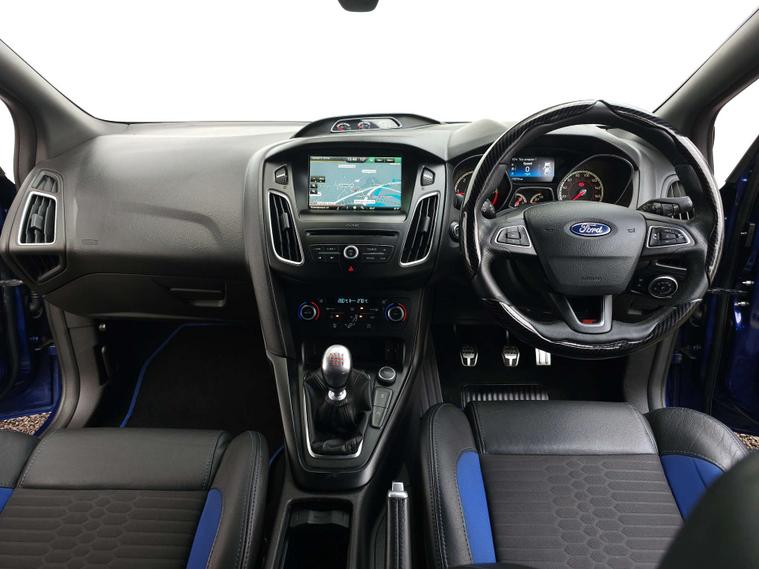 The specification highlights a Ford DAB Audio System, ST Recaro Seats, (Black & Blue), Navigation System, Bluetooth Interface with Audio Streaming, 8in Touchscreen Colour Display, Front and Rear Parking Sensors, 18in Unique ST Alloy Wheels, Electrically Operated and Heated Door Mirrors, MINI Steel Spare Wheel, ST Full Body Styling Kit, LED Daytime Running Lights, Keyless Start, Dual Zone Electronic Automatic Temperature Control Air Conditioning & Hill Start Assist.