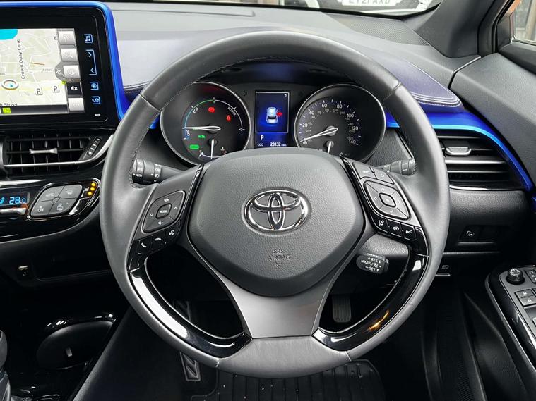 Stand out from the crowd with the luxurious Pearl White exterior and the stylish Fabric interior in Black and Blue. The Toyota C-hr is not just a car, it's a statement of sophistication and innovation.