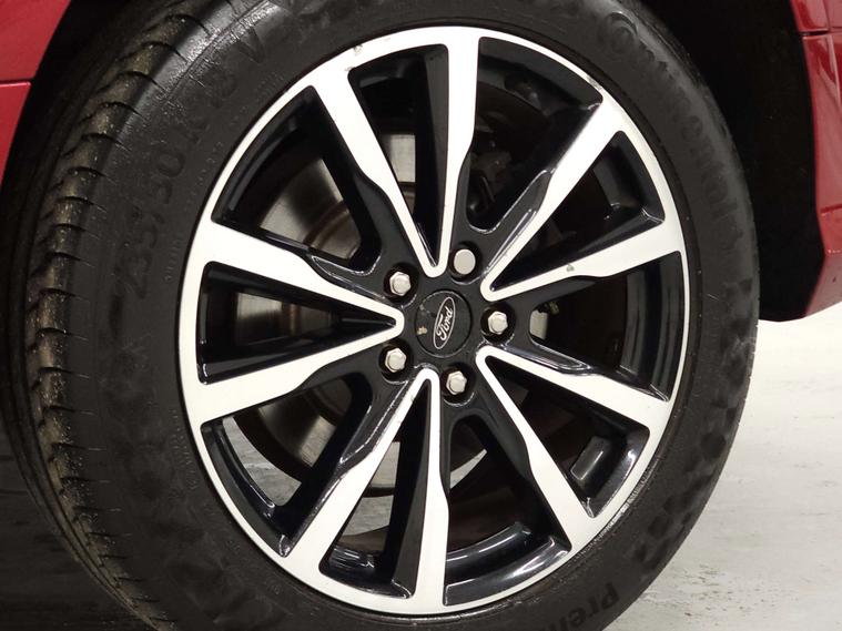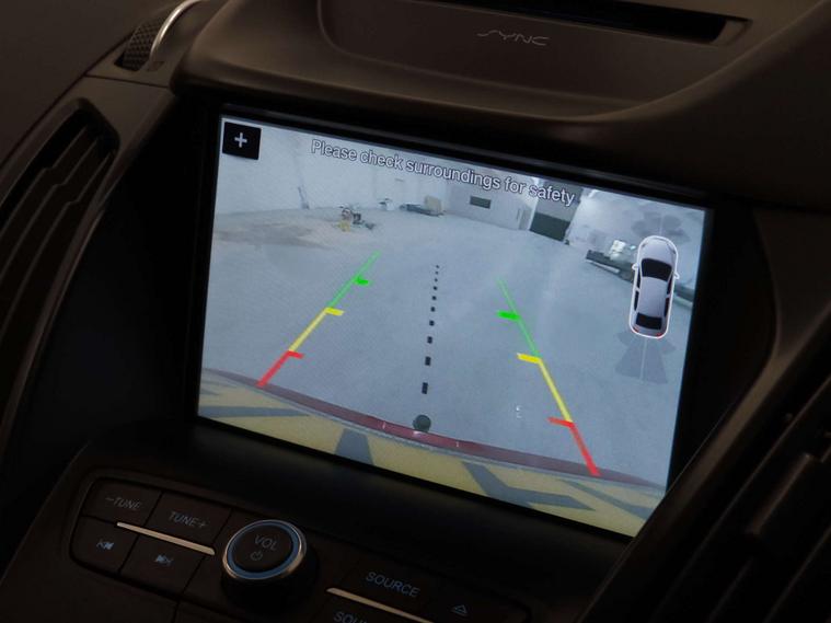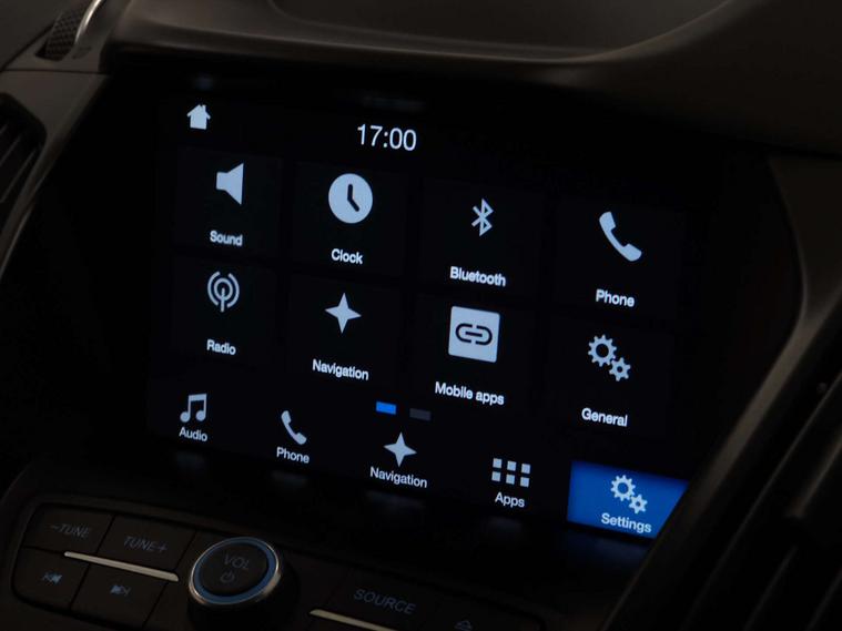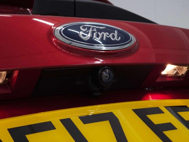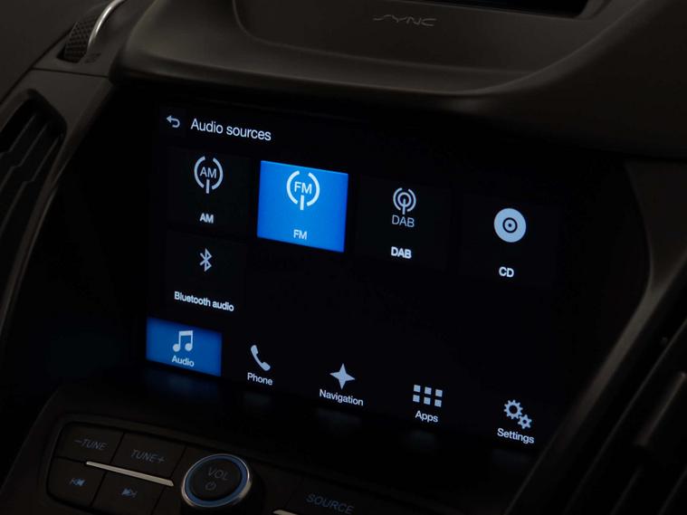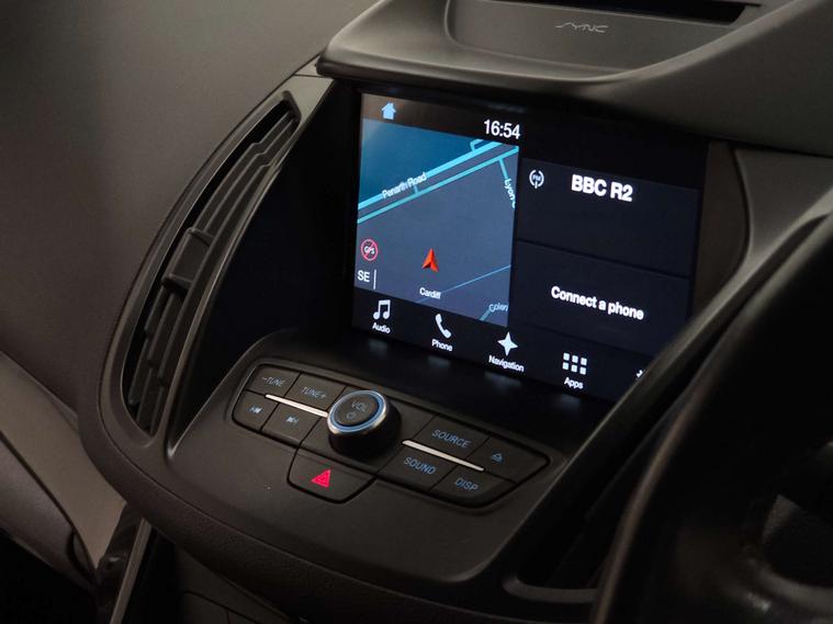 Specification highlights include cruise control with active speed limiter, enhanced active park assist, front and rear parking sensors, Ford SYNC 3 infotainment system with Apple CarPlay and Android Auto, DAB digital radio, navigation system, Bluetooth interface with audio streaming, LED daytime running lights, dual-zone electronic automatic temperature control (DEATC), keyless start, hill start assist, and ISOFIX child seat mounting points to the outer rear seats.