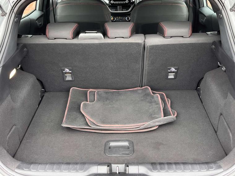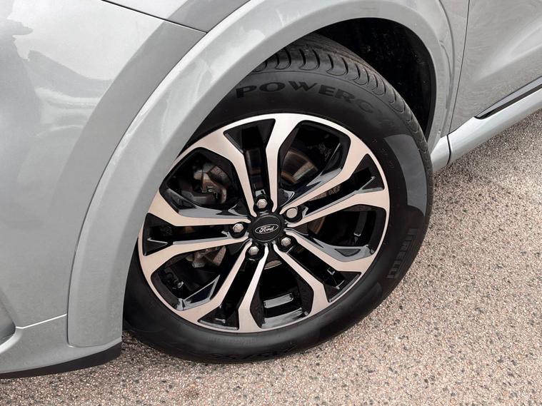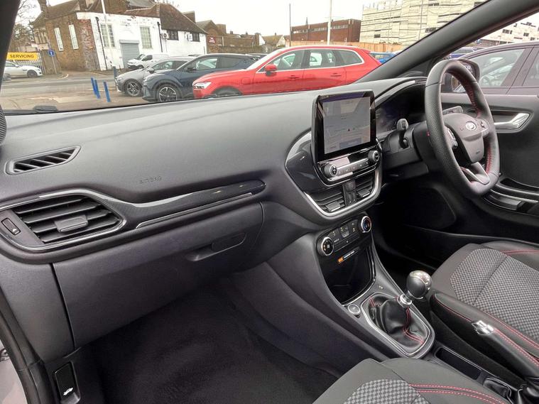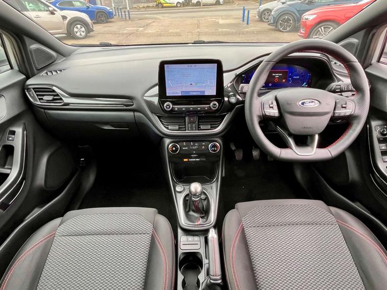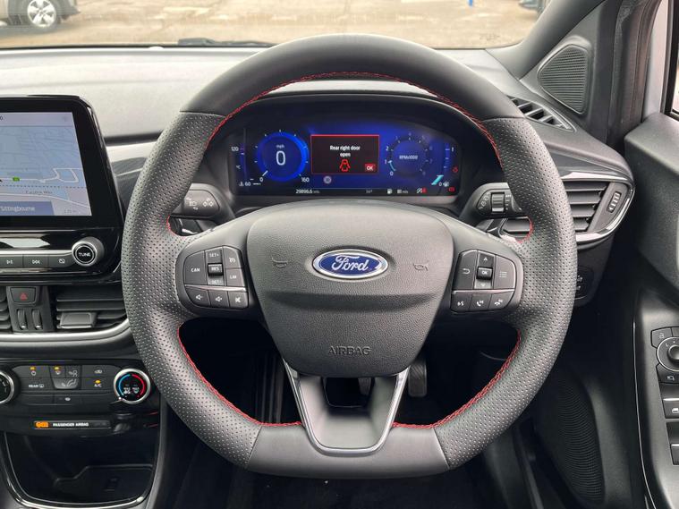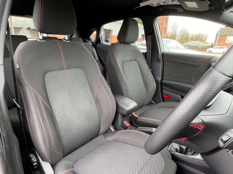 Finished in a sleek Solar Silver colour, the Ford Puma exudes sophistication and modernity. The interior features premium Cloth upholstery in Ebony with striking Red stitching, adding a touch of sporty elegance to the cabin.