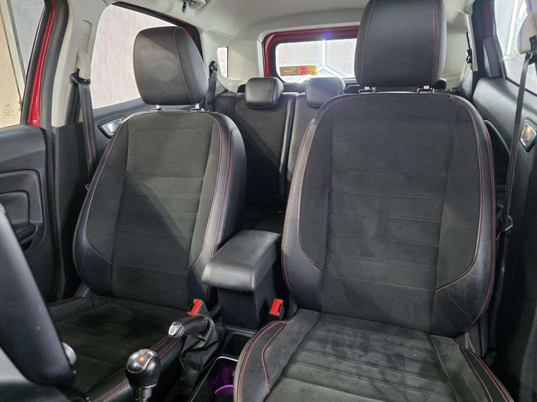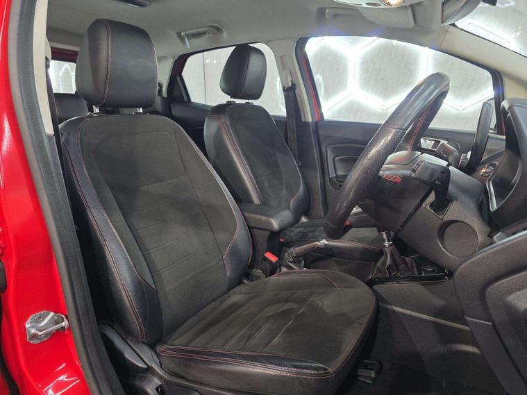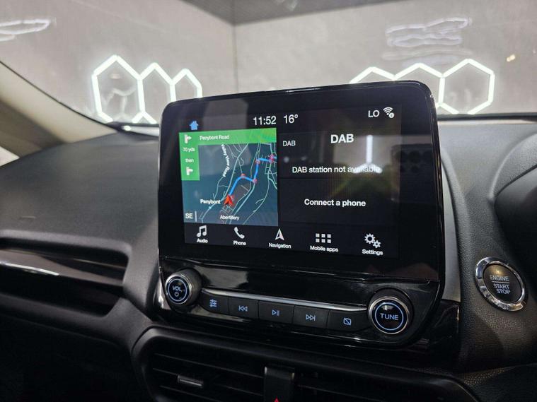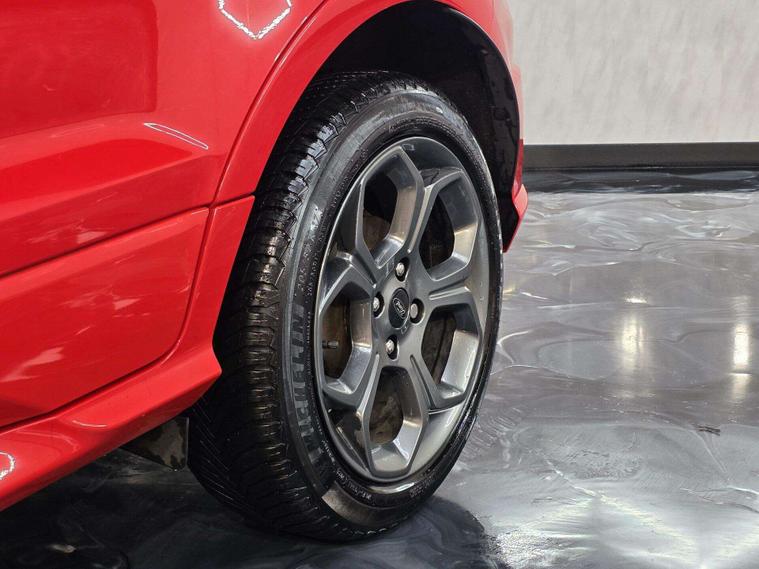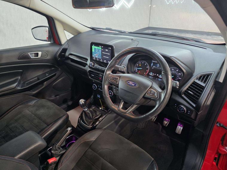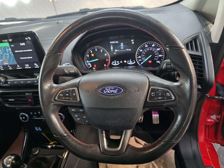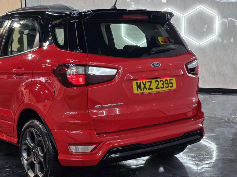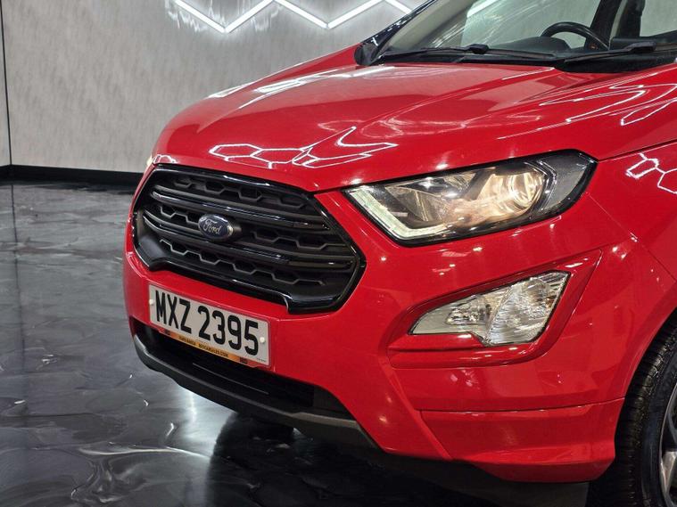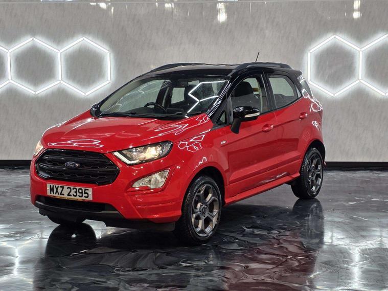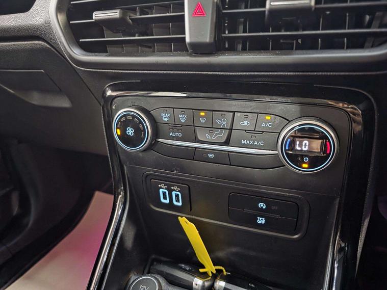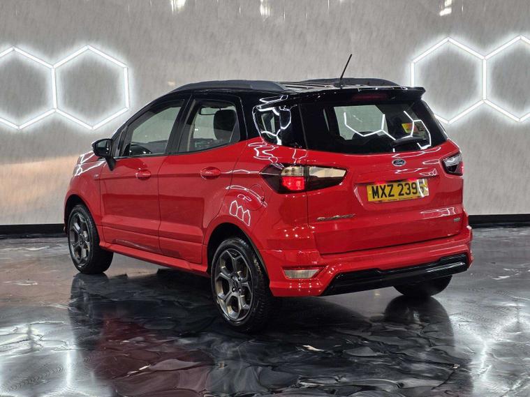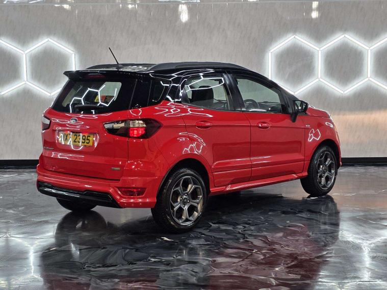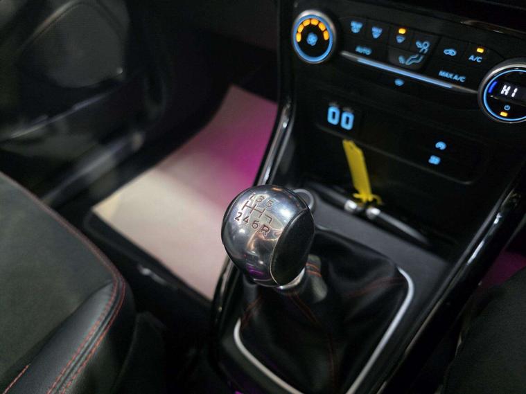 This Ford ST-Line stands out with 17in 5-Spoke Dark Tarnish alloys, ST-Line bumpers and skirts, roof rails, rear spoiler, body-coloured cladding, Quickclear heated windscreen, LED daytime running lights, halogen projector headlights, rear parking sensors, and reversing camera. Sporty touches include sports suspension, stainless steel pedals, red stitching details, and ST-Line threshold plates.