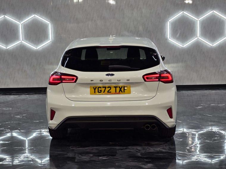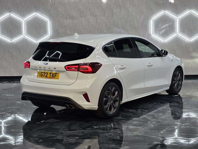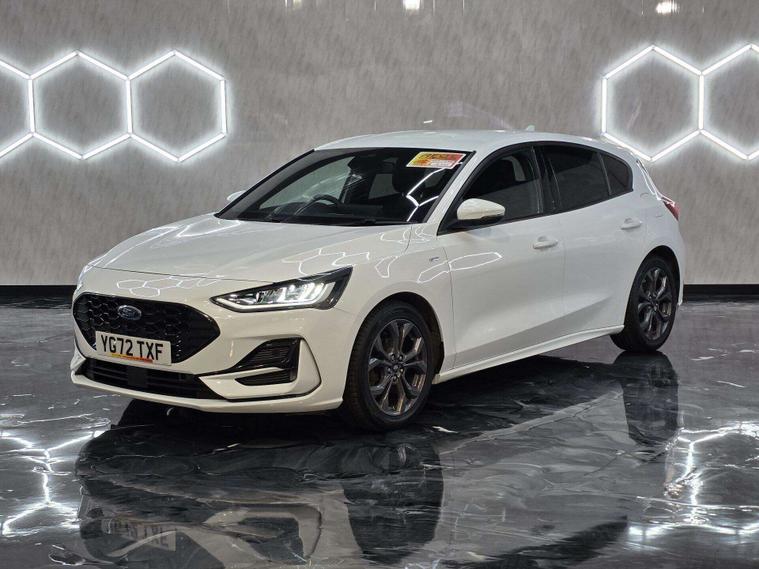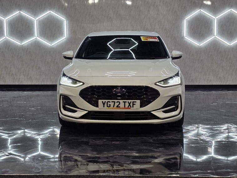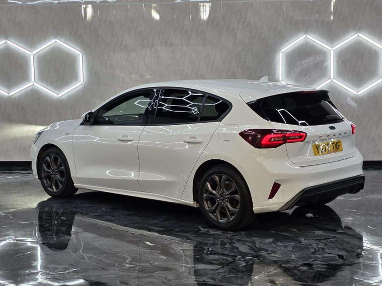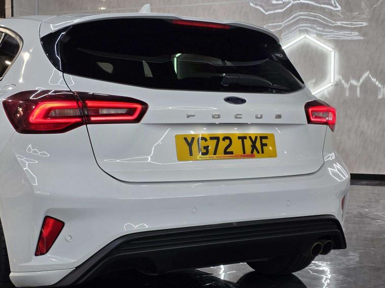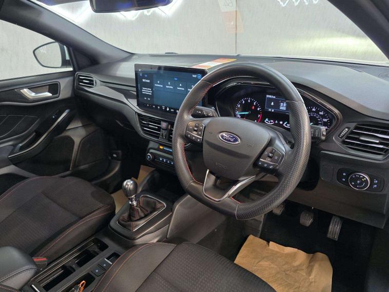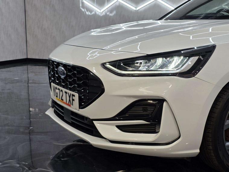 This 2019 Ford Focus ST-Line in Frozen White features 17" Rock Metallic alloy wheels, full ST-Line bodystyling, LED daytime running lights, LED fog lights, automatic headlights, and a Quickclear heated windscreen.