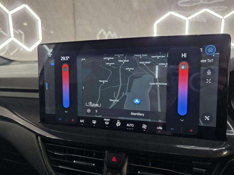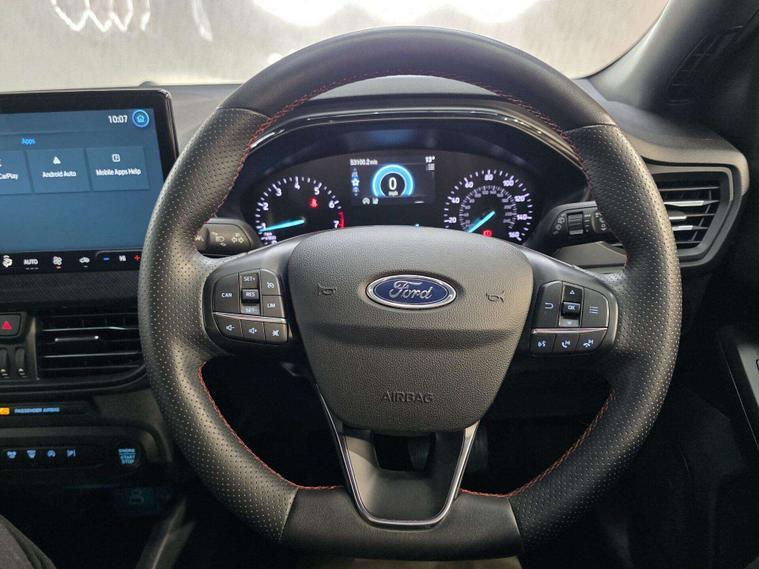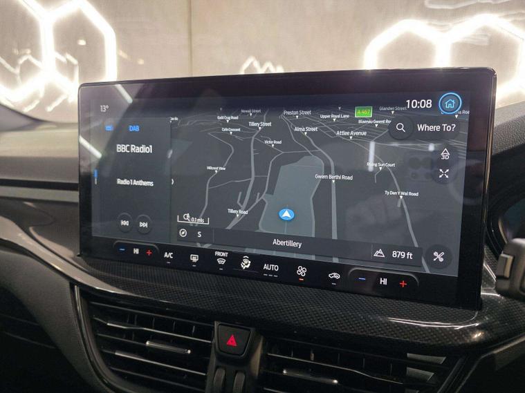 Inside, it offers sports seats, a leather flat-bottomed steering wheel, alloy pedals, red stitching, and a dark headliner. Tech includes a SYNC touchscreen display with FordPass Connect, satellite navigation, bluetooth hands free, bluetooth audio, cruise control, keyless start, selectable drive modes, rear parking sensors, and air con.