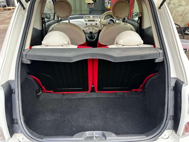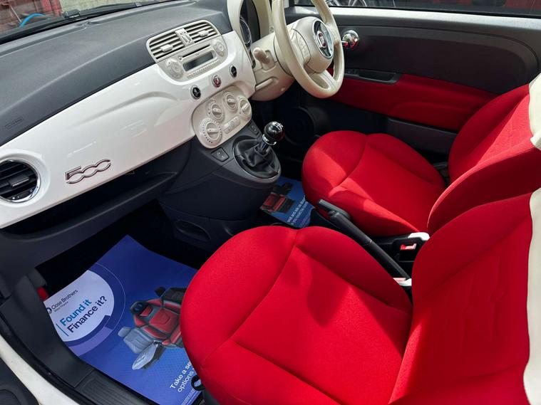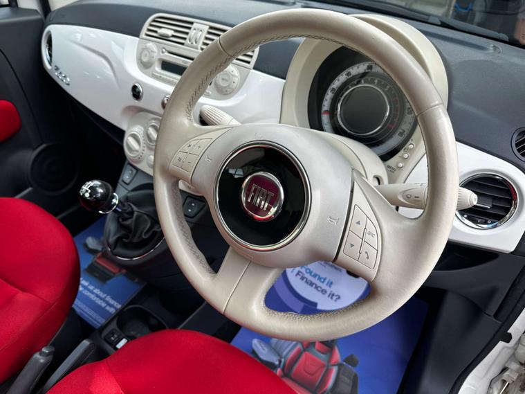 Finished in Bossa Nova White With Red Pop and Ivory Interior. This Fiat 500 Lounge Features Panoramic Glass Roof, Air Conditioning, Electric Front Windows, Remote Central Locking, Blue&Me Bluetooth Connectivity With USB & AUX Input, Leather Steering Wheel, Split Folding Rear Seats, Stop/Start Technology, Chrome Exterior Styling Pack, Rear Parking Sensors and Alloy Wheels.