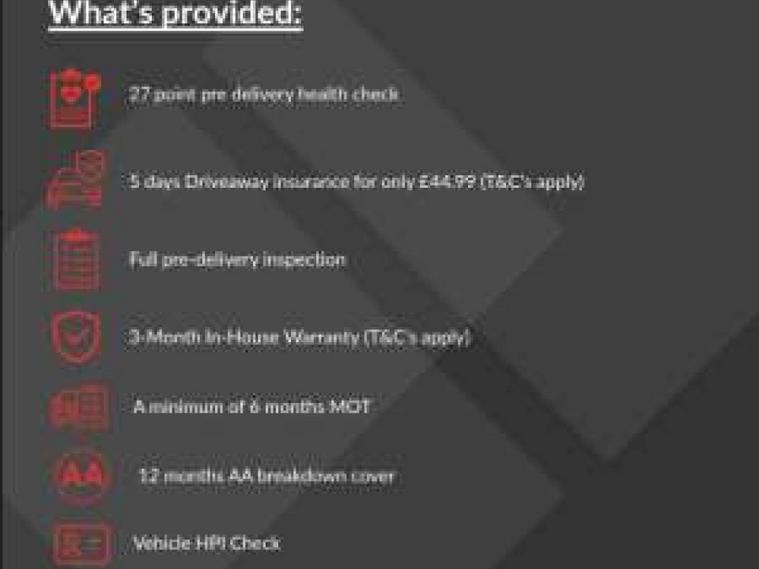 Every vehicle we sell comes with our Customer Care Pack for just £99, giving you extra peace of mind and great value. It includes a 27-point health check, a full pre-delivery inspection, a 3-month In-house warranty, and at least 6 months MOT. You’ll also get 12 months complimentary AA breakdown cover, a full HPI vehicle check, your online V5C logbook, and help with arranging your vehicle tax—so you’re all set from day one.