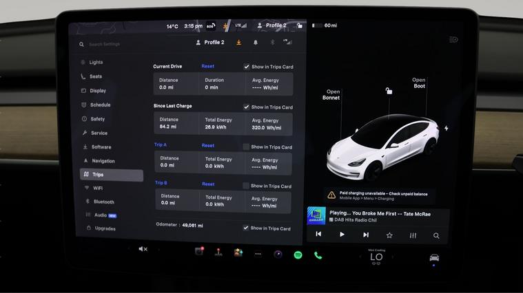 Our Tesla Model 3 is finished in White. Specification includes a range of fantastic features including Panoramic Roof, Adaptive Cruise Control, Satellite Navigation, Heated Seats, Wireless Phone Charging, Rear View Camera, Heated Steering Wheel, Bluetooth, Blind Spot Assist, Parking Sensors Specification information is supplied by CAPHPI and may vary to the actual car. This data does not form any part of a buying contact. Please check specification prior to purchase in-store. The MOT is valid until December 2026, visit dealer's website for more photos, a 360 tour, service history and a free HPI report.