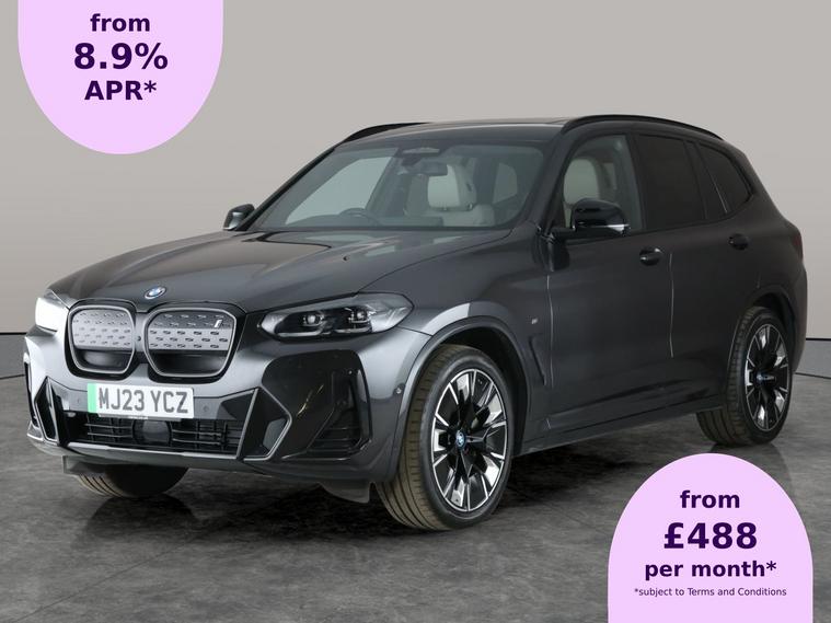 Experience pure electric luxury with this grey BMW iX3 M Sport. Enjoy scenic drives with the panoramic roof and sunroof, stay entertained by the upgraded Harman/Kardon Sound System, and keep effortlessly connected via Apple CarPlay. Take the stress out of parking with Parking Assistant Plus, front and rear cameras, surround view, and park assist. Adaptive cruise control, active lane assist, and a head-up display elevate every journey. Keyless entry and gesture control add a truly premium touch. 1 service recorded, last serviced on 06/03/2025 at 21, 009 miles. MOT to 29/03/2026. Visit our website for service history, online valuation, full vehicle specification plus multiple images. Certain features listed may be available via subscription packages at extra costs, please consult with BMW for details. This vehicle is VAT qualifying. Any feature/option specified here is from 3rd party data. We cannot guarantee the accuracy of any specification supplied by a 3rd party. We recommend that you physically check the specification of the vehicle on site prior to purchase. This information does not form part of the buying contract. Terms & Conditions apply. We have over 2, 000 cars available from our 10 national branches, check our website to see all our stock. Our Trustpilot rating is 4.4/5 with over 9, 000 reviews.
