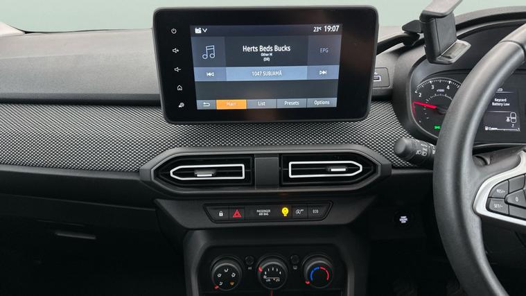 Discover the Dacia Sandero Expression in a striking blue finish. Enjoy seamless connectivity with Apple CarPlay, get in and go effortlessly with keyless entry, and park with confidence thanks to the reversing camera. Safety is a priority with lane departure warning and traffic sign recognition, while cruise control makes longer journeys a breeze. Stay comfortable all year round with air conditioning and keep connected on the move with Bluetooth. A superb choice for an affordable modern hatchback. 2 services recorded, last serviced on 01/07/2025 at 13, 236 miles. MOT to 01/09/2026. Visit our website for service history, online valuation, full vehicle specification plus multiple images. Any feature/option specified here is from 3rd party data. We cannot guarantee the accuracy of any specification supplied by a 3rd party. We recommend that you physically check the specification of the vehicle on site prior to purchase. This information does not form part of the buying contract. Terms & Conditions apply. We have over 2, 000 cars available from our 10 national branches, check our website to see all our stock. Our Trustpilot rating is 4.4/5 with over 9, 000 reviews.