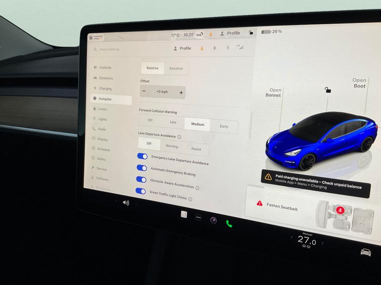 Experience pure electric power with this blue Tesla Model 3 Performance. Standout features include a panoramic roof and sunroof for an airy cabin feel, plus heated leather seats and a heated steering wheel for added comfort. Enjoy effortless journeys with adaptive cruise control, active lane assist, and blind spot assist. Parking is a breeze with park assist and a reversing camera. Keyless entry, LED headlights, sat nav, WiFi, and smart garage door access complete this innovative package. Enjoy the future of driving today. 1 service recorded, last serviced on 07/11/2025 at 18, 754 miles. MOT to 02/09/2026. Visit our website for service history, online valuation, full vehicle specification plus multiple images. This vehicle is VAT qualifying. Any feature/option specified here is from 3rd party data. We cannot guarantee the accuracy of any specification supplied by a 3rd party. We recommend that you physically check the specification of the vehicle on site prior to purchase. This information does not form part of the buying contract. Terms & Conditions apply. We have over 2, 000 cars available from our 10 national branches, check our website to see all our stock. Our Trustpilot rating is 4.4/5 with over 9, 000 reviews.