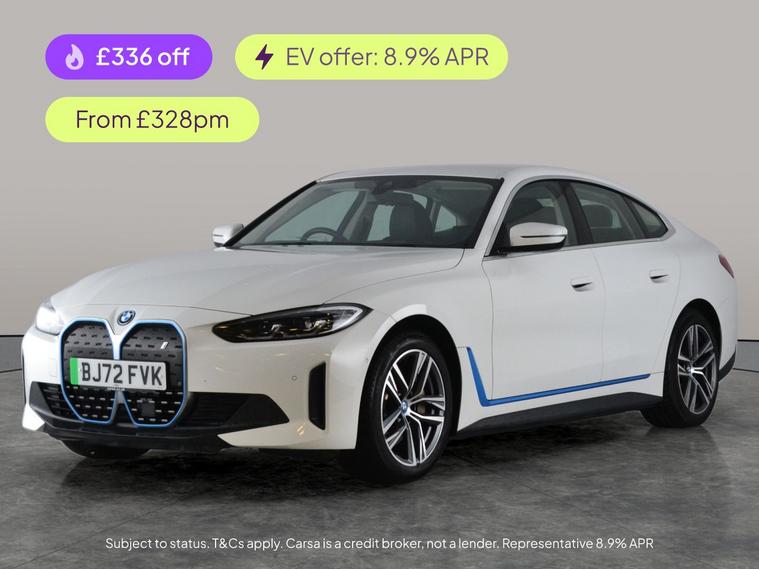 Experience the future with this BMW i4 Gran Coupe. Standout features include luxurious Cloth-Sensatec black interior, stylish aluminium exterior trim, and sleek aluminium mesh-effect interior touches. Enjoy seamless journeys with adaptive cruise control, park assist, keyless entry, and a reversing camera. Stay connected via Apple CarPlay, BMW Connected Package Professional, and Sat Nav. Appreciate comfort with heated seats and LED headlights for dynamic visibility. All wrapped up in a striking white finishan electric drive that's as smart as it is stylish. 2 services recorded, last serviced on 28/11/2025 at 41, 168 miles. MOT to 08/10/2026. Visit our website for service history, online valuation, full vehicle specification plus multiple images. Certain features listed may be available via subscription packages at extra costs, please consult with BMW for details. This vehicle is VAT qualifying. Any feature/option specified here is from 3rd party data. We cannot guarantee the accuracy of any specification supplied by a 3rd party. We recommend that you physically check the specification of the vehicle on site prior to purchase. This information does not form part of the buying contract. Terms & Conditions apply. We have over 2, 000 cars available from our 10 national branches, check our website to see all our stock. Our Trustpilot rating is 4.4/5 with over 9, 000 reviews.
