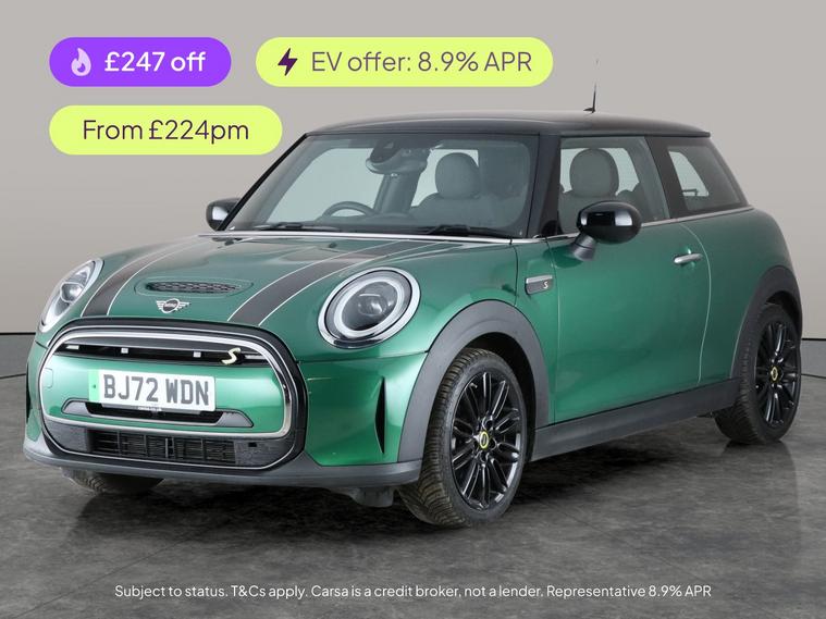 Turn heads in this stylish green Mini Electric Hatch Cooper SE, enhanced with sleek bonnet stripes, Black Pearl cloth-leatherette trim, and matching black roof and mirror caps. Enjoy ultimate comfort with heated seats and the convenience of keyless entry and Comfort Access. Stay connected using Apple CarPlay and built-in sat nav, while bluetooth audio streaming keeps the tunes rolling. Fitted with striking 17in Tentacle Spoke alloys, LED headlights, a reversing camera, and handy storage compartments, this electric Mini is fun, smart, and practical. 1 service recorded, last serviced on 08/01/2025 at 7, 836 miles. Visit our website for service history, online valuation, full vehicle specification plus multiple images. This vehicle is VAT qualifying. Any feature/option specified here is from 3rd party data. We cannot guarantee the accuracy of any specification supplied by a 3rd party. We recommend that you physically check the specification of the vehicle on site prior to purchase. This information does not form part of the buying contract. Terms & Conditions apply. We have over 2, 000 cars available from our 10 national branches, check our website to see all our stock. Our Trustpilot rating is 4.4/5 with over 9, 000 reviews.