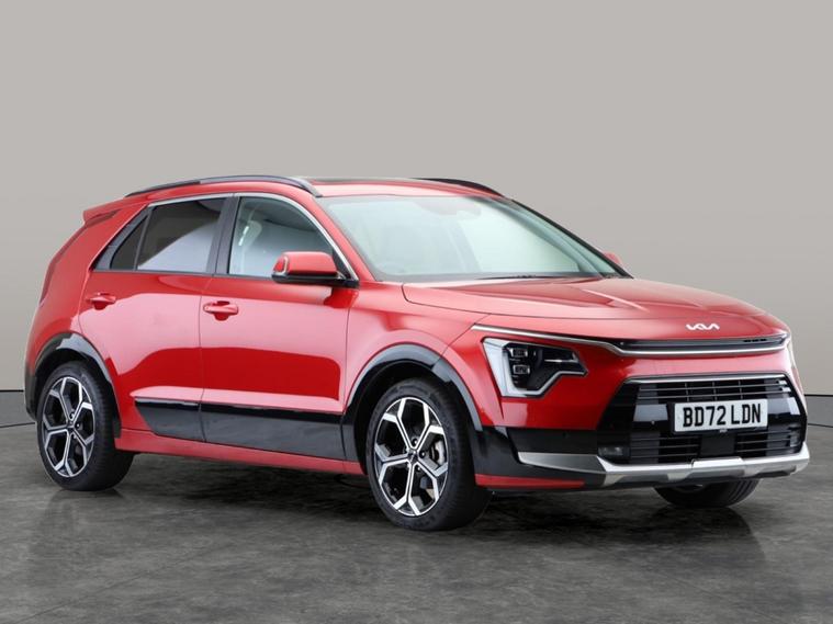 Discover the Kia Niro SUV in striking red, featuring premium touches like a panoramic sunroof and head-up display for a truly upmarket feel. Enjoy heated, electric, and memory seats, plus a heated steering wheel for year-round comfort. Stay connected with Apple CarPlay and Bluetooth audio streaming, and navigate with ease using the built-in sat nav. LED headlights, park assist, and a reversing camera provide extra confidence, while advanced safety tech includes blind spot assist and lane departure warning. A sophisticated hybrid choice with smart automatic convenience. 3 services recorded, last serviced on 11/09/2025 at 28, 990 miles. MOT to 10/10/2026. Visit our website for service history, online valuation, full vehicle specification plus multiple images. This vehicle is VAT qualifying. Any feature/option specified here is from 3rd party data. We cannot guarantee the accuracy of any specification supplied by a 3rd party. We recommend that you physically check the specification of the vehicle on site prior to purchase. This information does not form part of the buying contract. Terms & Conditions apply. We have over 2, 000 cars available from our 10 national branches, check our website to see all our stock. Our Trustpilot rating is 4.4/5 with over 9, 000 reviews.