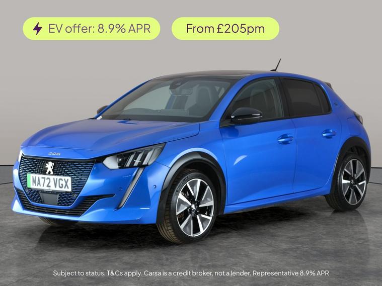 Experience the thrill of electric driving with this striking blue Peugeot E-208 GT Premium. Enjoy luxury touches like a panoramic roof, sunroof, and plush Alcantara heated seats. Safety and convenience are elevated with Adaptive Cruise Control, Head-Up Display, Active Lane Assist, Blind Spot Assist, and Lane Departure Warning. Effortless navigation comes with Park Assist, LED headlights, reversing camera, Apple CarPlay, Bluetooth audio streaming, and built-in sat nav. Modern style, advanced tech, and comfort blend perfectly in this standout hatchback. 3 services recorded, last serviced on 28/08/2025 at 28, 302 miles. MOT to 15/09/2026. Visit our website for service history, online valuation, full vehicle specification plus multiple images. This vehicle is VAT qualifying. Any feature/option specified here is from 3rd party data. We cannot guarantee the accuracy of any specification supplied by a 3rd party. We recommend that you physically check the specification of the vehicle on site prior to purchase. This information does not form part of the buying contract. Terms & Conditions apply. We have over 2, 000 cars available from our 10 national branches, check our website to see all our stock. Our Trustpilot rating is 4.4/5 with over 9, 000 reviews.