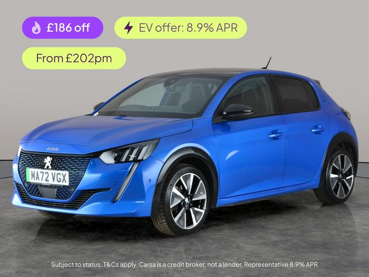 Experience the thrill of electric driving with this striking blue Peugeot E-208 GT Premium. Enjoy luxury touches like a panoramic roof, sunroof, and plush Alcantara heated seats. Safety and convenience are elevated with Adaptive Cruise Control, Head-Up Display, Active Lane Assist, Blind Spot Assist, and Lane Departure Warning. Effortless navigation comes with Park Assist, LED headlights, reversing camera, Apple CarPlay, Bluetooth audio streaming, and built-in sat nav. Modern style, advanced tech, and comfort blend perfectly in this standout hatchback. 3 services recorded, last serviced on 28/08/2025 at 28, 302 miles. MOT to 15/09/2026. Visit our website for service history, online valuation, full vehicle specification plus multiple images. This vehicle is VAT qualifying. Any feature/option specified here is from 3rd party data. We cannot guarantee the accuracy of any specification supplied by a 3rd party. We recommend that you physically check the specification of the vehicle on site prior to purchase. This information does not form part of the buying contract. Terms & Conditions apply. We have over 2, 000 cars available from our 10 national branches, check our website to see all our stock. Our Trustpilot rating is 4.4/5 with over 9, 000 reviews.
