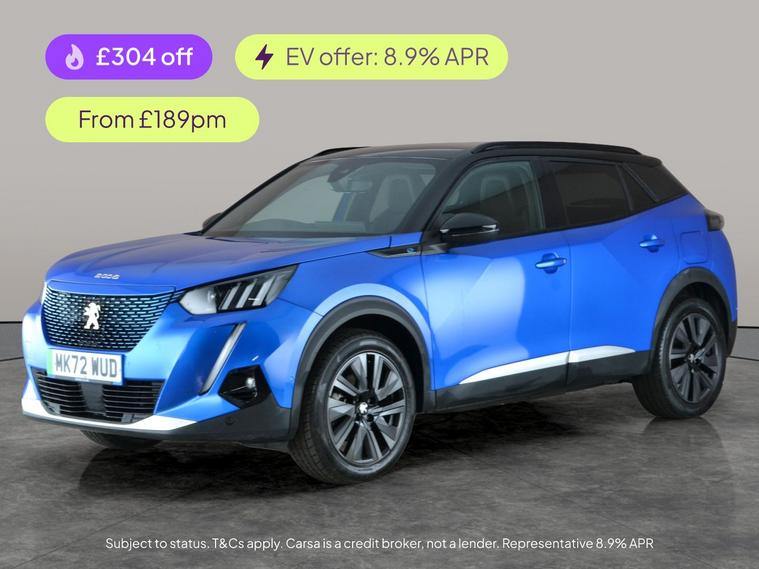 Experience electric driving in style with the Peugeot E-2008 GT. Enjoy luxury touches like Alcantara seats, a Head-Up Display, and wireless charging. Stay effortlessly connected with Apple CarPlay and built-in Sat Nav. Safety is at the forefront with Adaptive Cruise Control, Blind Spot Assist, Lane Departure Warning, and Traffic Sign Recognition. LED headlights illuminate your way, while keyless entry and a reversing camera make every journey smoother. This striking blue SUV blends performance, technology, and comfort seamlessly. 2 services recorded, last serviced on 12/01/2026 at 25, 991 miles. MOT to 22/05/2026. Visit our website for service history, online valuation, full vehicle specification plus multiple images. Any feature/option specified here is from 3rd party data. We cannot guarantee the accuracy of any specification supplied by a 3rd party. We recommend that you physically check the specification of the vehicle on site prior to purchase. This information does not form part of the buying contract. Terms & Conditions apply. We have over 2, 000 cars available from our 10 national branches, check our website to see all our stock. Our Trustpilot rating is 4.4/5 with over 9, 000 reviews.