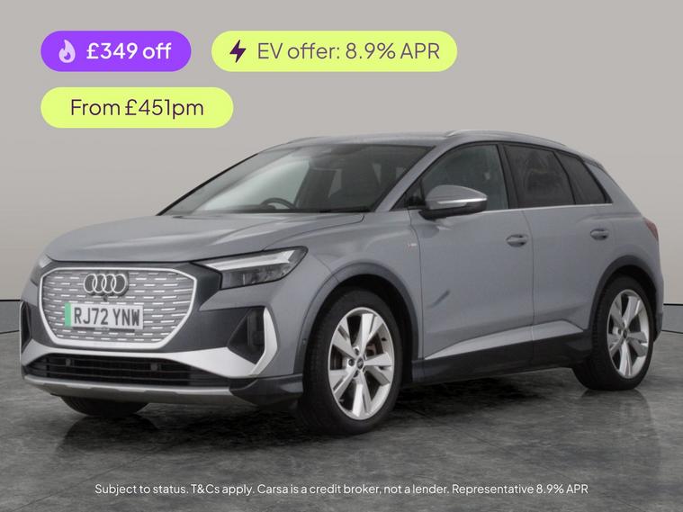 Experience the future with this grey Audi Q4 E-tron SUV. Enjoy the premium upgraded sound system while staying comfortable with heated seats and climate control. Navigate with ease using MMI Navigation Plus and Sat Nav, and drive in confidence thanks to LED headlights, lane departure warning, and traffic sign recognition. Cruise control, Bluetooth connectivity, and a versatile charging lead add convenience to every journey. Sophisticated, smart, and fully electricthe perfect city and family companion. 1 service recorded, last serviced on 30/01/2025 at 13, 656 miles. MOT to 19/12/2026. Visit our website for service history, online valuation, full vehicle specification plus multiple images. Certain features listed may be available via subscription packages at extra costs, please consult with Audi for details. This vehicle is VAT qualifying. Any feature/option specified here is from 3rd party data. We cannot guarantee the accuracy of any specification supplied by a 3rd party. We recommend that you physically check the specification of the vehicle on site prior to purchase. This information does not form part of the buying contract. Terms & Conditions apply. We have over 2, 000 cars available from our 10 national branches, check our website to see all our stock. Our Trustpilot rating is 4.4/5 with over 9, 000 reviews.