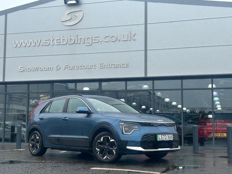 This vehicle may have peen previously used for private hire. This 2023 Kia Niro 2 is a superb example, having had only one owner since new. As an all electric model, it offers a substantial battery total capacity of 68 kWh, providing a maximum range of 285 miles when new. This impressive electric vehicle also features Dual Temperature Control with air conditioning, a reversing camera with dynamic guidelines integrated into the centre fascia screen for easy parking assistance, and automatic headlight control. For added convenience and safety, it is equipped with Adaptive Smart Cruise Control with stop and go functionality, along with rear parking sensors.