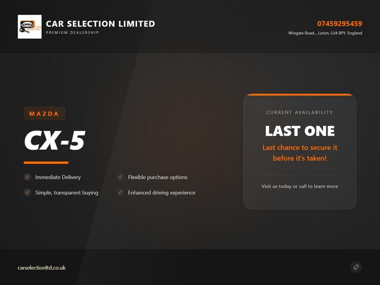 19in Alloy Wheels - Metallic, 7in Colour Touch Screen Display, ABS - Anti Lock Braking System, AUX and USB Input, Advanced Blind Spot Monitoring with Rear Cross Traffic Alert, Advanced Smart City Brake Support, Air Conditioning - Dual Zone Climate Control, Auto Dimming Rear View Mirror, Auto Door Locking, Bumpers - Body Coloured, Dome Interior Courtesy Light with Integrated Spotlight, Door Mirrors - Electrically Adjustable - Heated - Power Folding with Integrated Indicator Lights, Door Pockets - Driver - Front Passenger and Rear, Dual Exhaust System, Dual Front Airbags, Dusk Sensing Automatic Headlights, Dynamic Stability Control with Traction Control System, Electric Windows - Front and Rear with One-Touch Auto Down - Up, Electronic Parking Brake with Auto-Disengage Function, Emergency Tyre Repair Kit, Engine Start-Stop Button, Front Centre Console with Storage Box, Front Fog Lights - LED, Front Passenger Airbag Cut-Off Switch, Front Side Airbags, Front Wiper De-Icer, Front and Rear Curtain Airbags, Front and Rear Parking Distance Sensors, Gear Shift - Leather-Wrapped, Glovebox Illumination, Grab Handles - Front Passenger and Two Rear with Coat Hooks, Head Restraints - Rear x3, Headlights - Adaptive Front Lighting System, Headlights - Coming-Leaving Home, Headlights - LED with Auto Headlight Levelling, Heated Front Seats with 3-Stage Settings, High Beam Control, Hill Hold Assist, ISOFIX Child Seat Anchorage for Outer Rear Seats, Integrated Bluetooth, Karakuri Tonneau Cover, LED Daytime Running Lights, Lane Keep Assist with Lane Departure Warning System, Luggage Compartment - Light, Luggage Compartment - Power Outlet, Mazda Navigation System - European Mapping with Alternative Route Calculations - Point of Interest Search and 3-Years Free Map Updates, Mazda Radar Cruise Control with Stop and Go Function, Meter Set Display - Window Projection Colour Active Driving Display with Traffic Sign Recognition - Colour Head-Up Display - Shows Vehicle Speed - Warnings and Turn-by-Turn Navigation, Multimedia Commander, Power Assisted Steering - Electronic, Power Liftgate, Premium BOSE Centrepoint Surround Sound System, Privacy Glass - Rear and Rear Side Windows, Rain-Sensing Front Wipers, Rear Air Vents, Rear Seats - Centre Armrest with Two Cupholders, Rear Seats - Manual Recline Adjustment, Remote Central Locking with Deadlocking, Reversing Camera, SCR - Secondary Collision Reduction, Seat - 40-20-40 Karakuri Fold Flat Rear, Seatback Pocket - Driver and Front Passenger, Seatbelt Reminder for Front and Rear, Seatbelts - Front - 3 Point - ELR x 2 with Pre-Tensioners, Seatbelts - Rear - 3-Point - ELR, Seats - Drivers Power Lumbar Adjustment, Seats - Drivers Power Slide-Recline and Height Adjustment with Memory Function linked to Smart Key, Seats - Passengers Power Slide-Recline and Height Adjustment, Shark Fin Antenna, Smart Brake Support with Forward Obstruction Warning, Smart Remote Keyless Entry System, Spoiler - Rear Roof Body Coloured, Steering Wheel - Heated, Steering Wheel - Leather Wrapped, Steering Wheel - Mounted Audio and Bluetooth Controls, Steering Wheel - Tilt and Height Adjustment, Storage Spaces - Inside Front Centre Armrest, Sunroof - Power Tilt and Slide, Sunvisors - Drivers and Passengers with Covered Vanity Mirror-Ticket Holder-Illumination, Thatcham Category 1 Alarm and Immobiliser, Trip Computer, Two Cup Holders Between Driver and Passenger Seat, USB - iPod Connectivity, Wipers - Rear Adjustable Speed with Intermittent, i-Stop Status