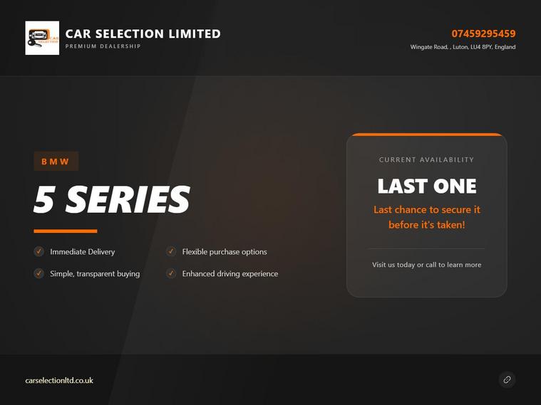 12V Power Socket - Front, 12V Power Socket - Rear of Centre Console, 18in Alloy Wheels - Light Multi-spoke Style - 454, 20GB HDD Memory, 6.5in Colour Display Screen, Air Conditioning - Automatic with Extended Features, Airbags, Alarm System - Thatcham 1 with Remote Control and Engine Immobiliser, All Round Anti-Corrosion System with Partial Hot Galvanising - Phosphate Treatment and Cathodic Dip Paintwork - Preservation of Hollow Cavities - Underfloor Protection, Ambient Interior Lighting, Armrests - Front and Rear - Centre with Storage Compartments, Automatic Start-Stop Button, Automatically Dimming Rear View Mirror, Auxiliary Input, BMW ConnectedDrive Online Services, BMW ConnectedDrive Services, BMW Emergency Call, BMW Professional Radio - Single CD and MP3, BMW TeleServices, Battery in Luggage Compartment with Jump Start Facility in Engine Bay, Bluetooth Hands Free with USB Audio Interface, Brake Callipers - Aluminium - Front and Rear, Brake Pad Wear Indicator, Check Control Warning System, Child Locking System - Rear Doors, Child Seat ISOFIX Attachment - Two in Rear, Concierge Service, Courtesy Lights - Front and Rear with Soft On-Off Dimming, Crash Sensor, Cruise Control with Brake and Speed Limiting Function, Cup Holders - Front and 2x Rear, DAB Digital Radio, DSC - Dynamic Stability Control Plus, Daytime Running Lights, Deformation Zones - Front and Rear, Door Sill Finishers - Illuminated with BMW Designation, Double-Wishbone Suspension - Front, Drive Performance Control with ECO PRO - Comfort and Sport Modes, Dynamic Brake Lights, EPS - Electric Power Steering with Servotronic, Electric Windows - Front and Rear with Open-Close Fingertip Control - Anti-Trap Facility and Comfort Closing Function, Electro Mechanical Parking Brake, Exhaust Tailpipes - Single - Left and Right - Chrome, Exterior B Pillar and Mirror Base Housing - High Gloss Black, Exterior Door Handles with Chrome Strips and Lighting, Exterior Mirrors - Aspheric - Heated with Electric Adjustment, Exterior Parts in Body Colour - Bumpers-Side Sills-Door Handles-Exterior Mirror Housing, Exterior Trim - Chromeline, Favourite Buttons, First Aid Kit and Warning Triangle, Floor Mats - Velour, Fogging Sensor - Front Windscreen, Footwell Lights - Front, Front Air Inlet with Chrome Finisher, Full Black Panel Display, Glove Box, Headlight Range Control - Electric, Headlight Wash, Indicator Lenses - Clear, Integral Rear Axle, Interior Trim - Fineline Anthracite Wood, Keyless Starting of Engine Ignition, Kidney Grille - Chrome Plated, LED Fog Lights - Front, Locking Wheel Bolts, Loudspeaker System with Six Speakers, Luggage Compartment Storage, Model Designation Deletion - Side, Navigation System - BMW Professional Multimedia, OBC - On-Board Computer, OBD - On Board Diagnosis, Optimum Shift Indicator, PDC - Park Distance Control - Front and Rear, Personal Profile, Rain Sensor with Automatic Headlight Activation, Reading Lights - Front and Rear, Real Time Traffic Information, Rear Bumper with Chrome Finisher - Tailgate Trim, Rear Fog Light, Remote Control Including Integrated Key in Black with Insert in Chrome, Remote Services, Roof Rails - Matt Aluminium, Run Flat Tyres, Seat Belts - Front - Inertia Reel with Pyrotechnical Belt Latch Tensioner - Belt Force Limiter and Belt Restrainer, Seat Belts - Rear - Three with Inertia Reel and Belt Force Limiter for Outer Seats, Seat Heating - Front, Seats - Front - Part Electric Adjustment, Seats - Height Adjustable Drivers, Self-levelling Air Suspension - Rear, Shark Fin Aerial, Side Impact Protection, Smokers Package, Split Folding Rear Seat - 40-20-40 with Additional Release Mechanism in Luggage Compartment, Sport Multi-Function Leather Steering Wheel - Three-Spoke, Steering Column with Manual Reach and Rake Adjustment, Sun Visors with Illuminated Vanity Mirrors, TPMS - Tyre Pressure Monitoring System, Tailgate Operation - Powered, Tailgate Window - Independently Opening, Toolkit located in luggage compartment, USB Audio Interface, Voice Control, Windows - Heat Insulated-Green Tinted All Round, Windscreen Washer Jets - Heated, Windscreen Wiper - Rear, Xenon Headlights, iDrive Touch Controller with Shortcut Buttons