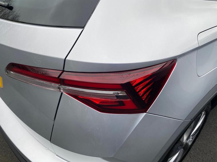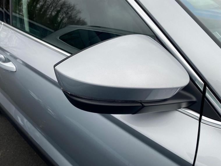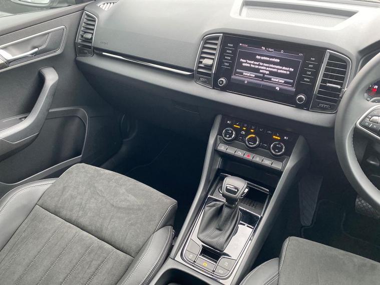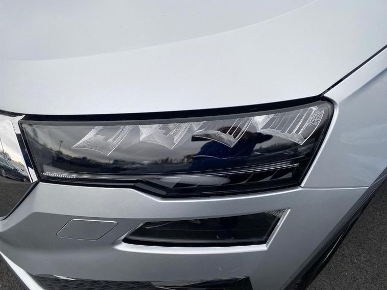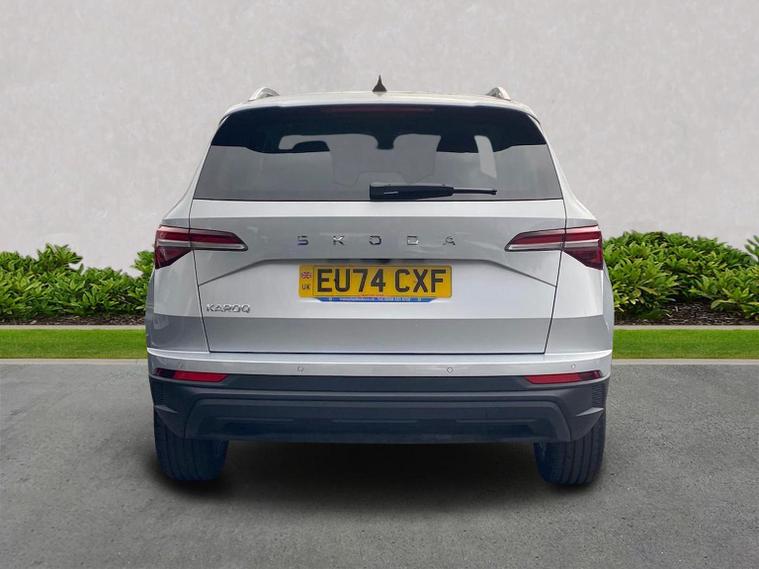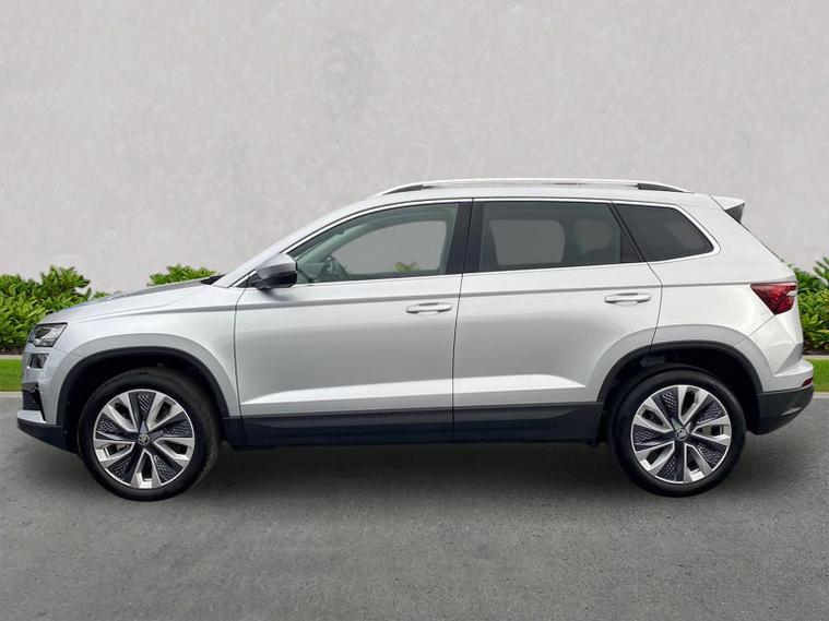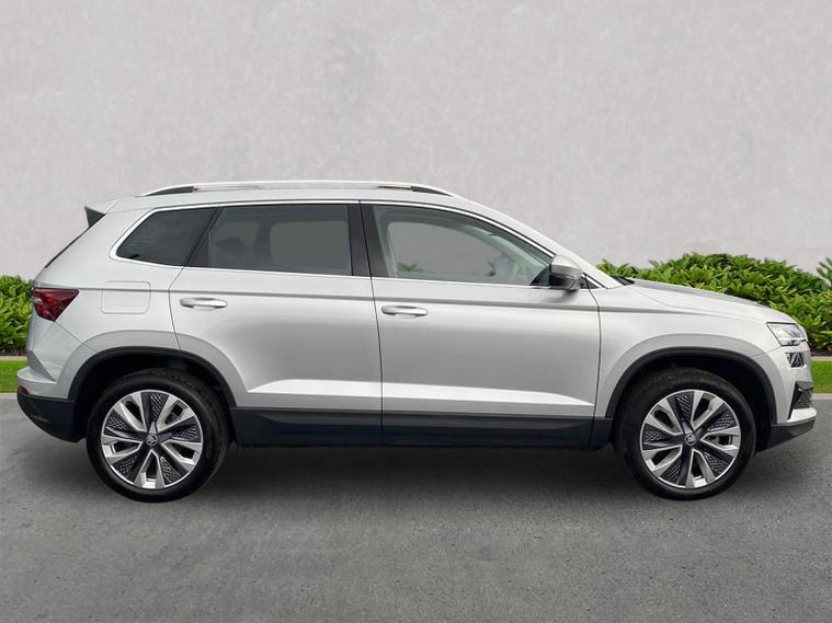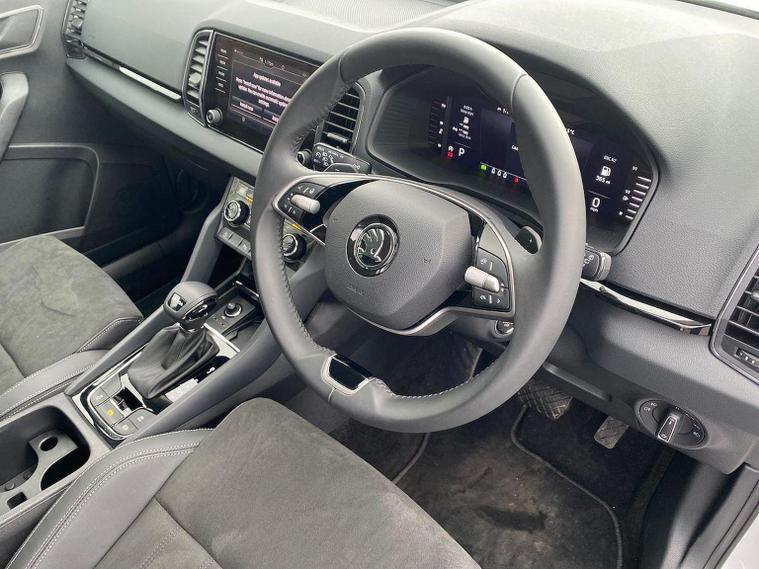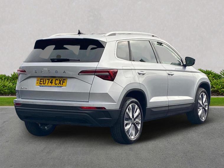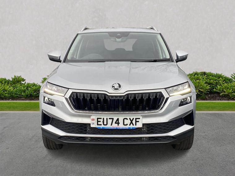Finished in Brilliant Silver Metallic, this ŠKODA Karoq SE L is a well-specified family SUV powered by the responsive 1.5 TSI petrol engine producing 150 PS and paired with a smooth DSG automatic gearbox, delivering a great balance of performance, economy and everyday usability. This SE L model features satellite navigation, smartphone connectivity via Apple CarPlay and Android Auto, Bluetooth, DAB radio and a multifunction heated leather steering wheel with DSG paddles. Comfort and convenience are covered with keyless entry and start, heated front seats, front and rear parking sensors, a rear-view camera, drive mode select, ECO mode and supportive comfort front seats trimmed in fabric upholstery. Driver assistance and safety systems include tyre pressure monitoring, an alarm with interior monitoring, parking sensors front and rear and reversing camera for easy manoeuvring. Inside, the Lounge interior adds chrome detailing, decorative trim inserts, Karoq-branded door steps and a practical, high-quality cabin feel. Exterior highlights include 18-inch Procyon silver alloy wheels, chrome roof rails, rear spoiler, headlight washers and crisp Brilliant Silver Metallic paintwork. We can provide a personalised walk-around video, arrange a test drive, discuss flexible finance options and organise home delivery if required. Get in touch today to reserve this vehicle or find out more.