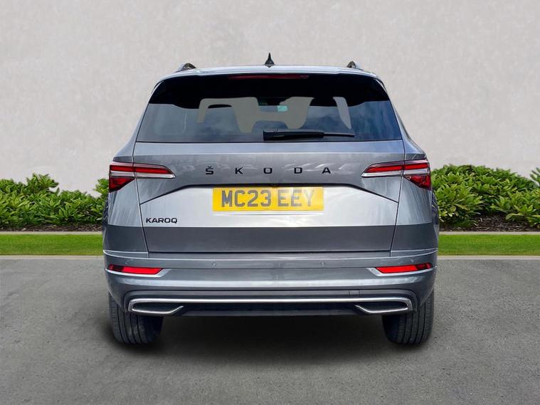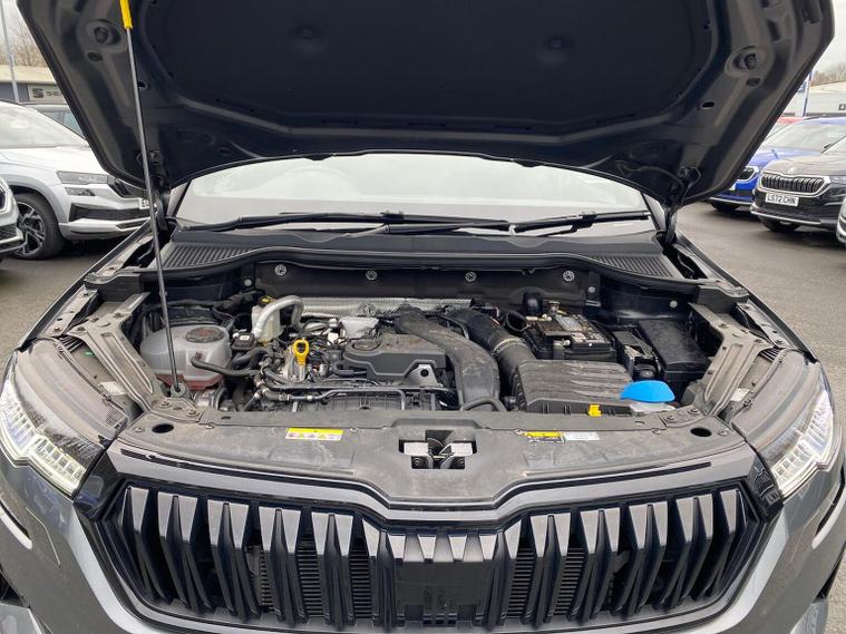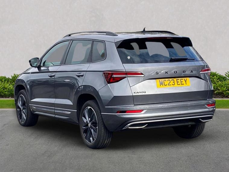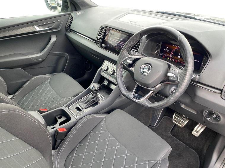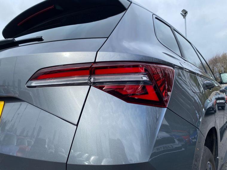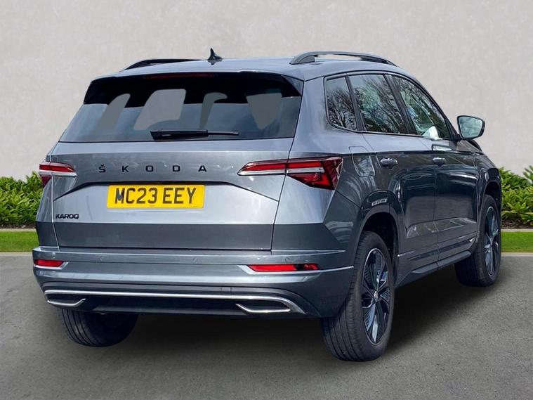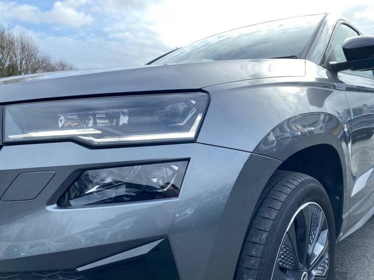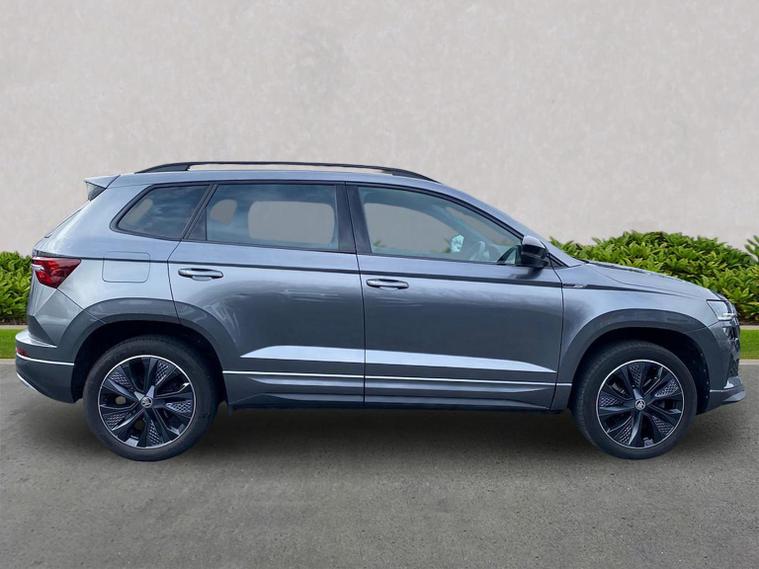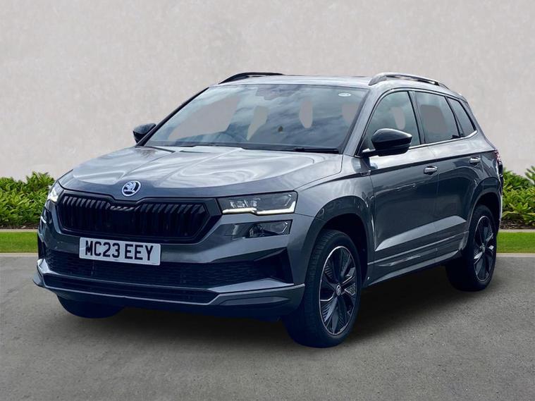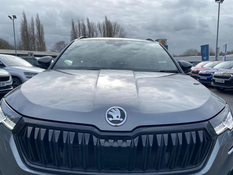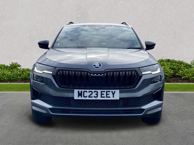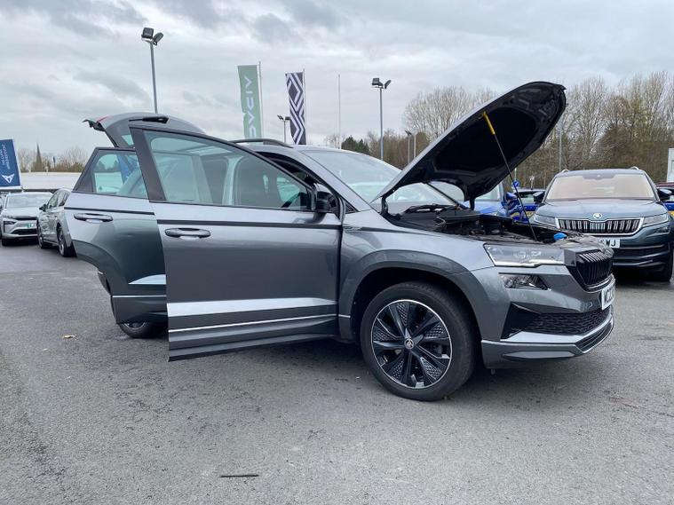 This Škoda Karoq SportLine 1.5 TSI 150PS DSG in Graphite Grey Metallic with black upholstery includes 19" Sagittarius anthracite alloy wheels with matt black aero inserts, a panoramic glass roof, SportLine exterior styling with black roof rails, black mirrors, black grille, sports bumpers, rear diffuser, rear spoiler and privacy glass. Standard equipment includes the Amundsen satellite navigation system with DAB, Bluetooth, SmartLink, wireless charging, USB-C ports, 8 speakers, emergency call, Proactive Services and Remote Access. Driver assistance features include cruise control with speed limiter, Drive Mode Selection, front and rear parking sensors, rear view camera, Driver Fatigue Sensor, TPMS and light assistant. It also includes Full LED Matrix headlights with adaptive lighting, fog lights, LED rear lights with dynamic indicators and welcome effect, heated and auto-dimming folding mirrors, heated windscreen washer nozzles and electric front and rear windows. Inside it offers sport seats, heated front seats, dual-zone climate control, an 8" digital dashboard, virtual cockpit, leather sports heated steering wheel, illuminated interior with LED package, SportLine decorative inserts, black roof headlining, electric tailgate with virtual pedal, double-sided boot floor, boot package with hooks and nets, storage drawers under the seats, illuminated glovebox, umbrella under the passenger seat, rubbish bin in the door, textile floor mats and multiple storage features. Safety equipment includes front, side, head, knee and curtain airbags, Front Assist, pedestrian monitor, ESC, hill hold, ISOFIX on the outer rear seats, keyless entry and start, alarm with tilt sensor, automatic crash unlocking and fuel cut-off. We offer in-person appointments, personal video appointments, test drives and finance options.