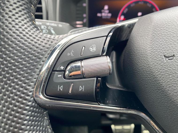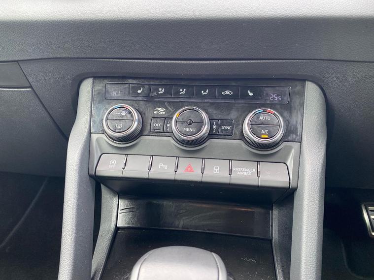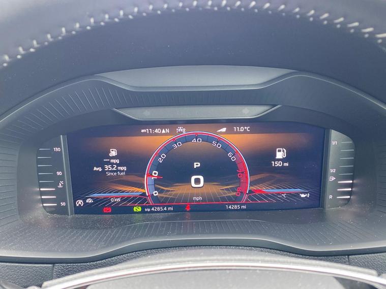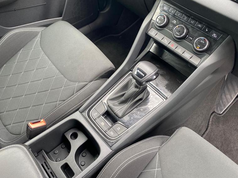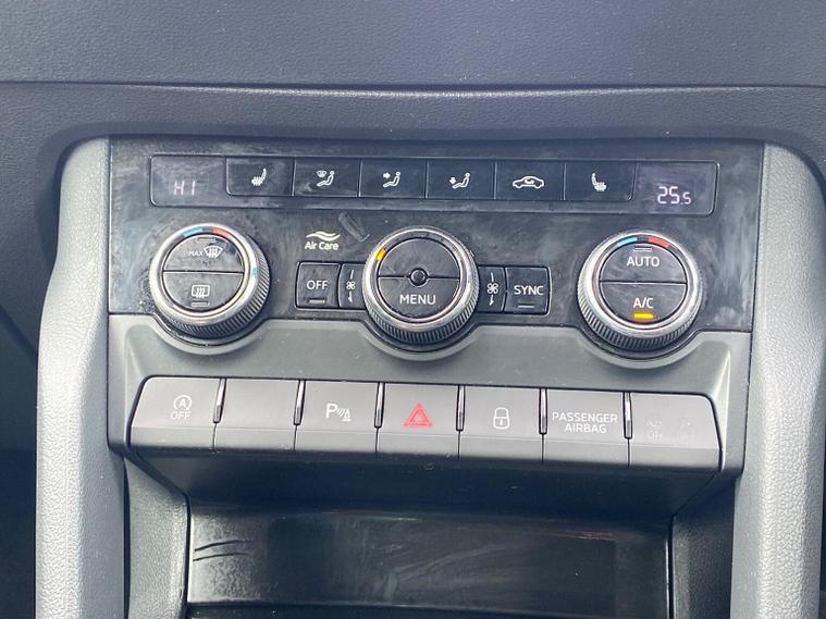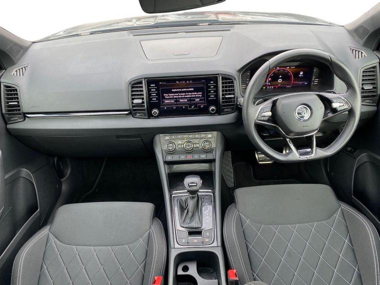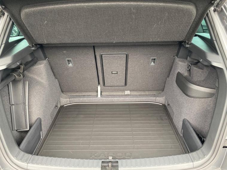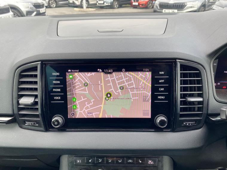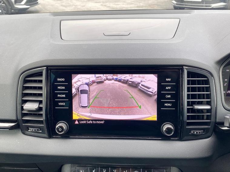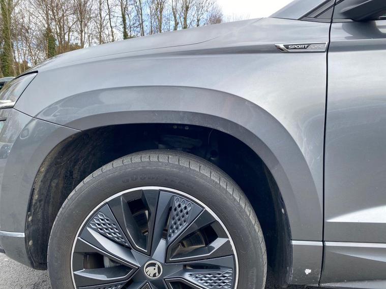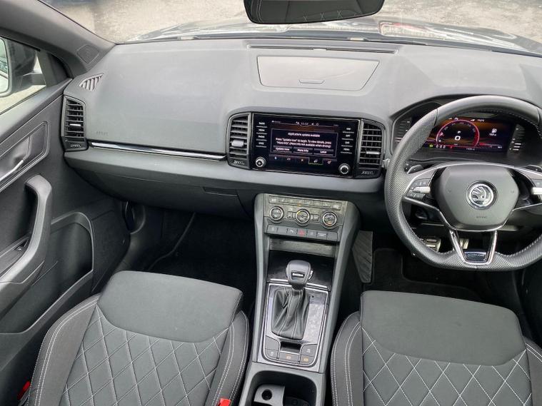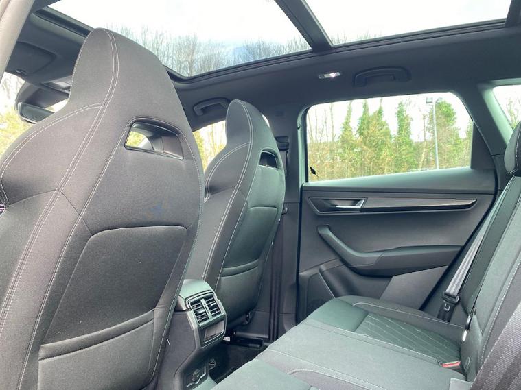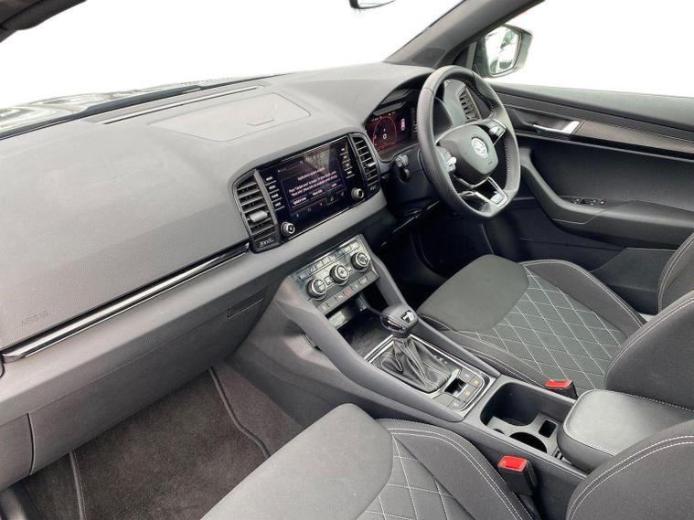 This Škoda Karoq SportLine 1.5 TSI 150PS DSG in Graphite Grey Metallic with black upholstery includes 19" Sagittarius anthracite alloy wheels with matt black aero inserts, a panoramic glass roof, SportLine exterior styling with black roof rails, black mirrors, black grille, sports bumpers, rear diffuser, rear spoiler and privacy glass. Standard equipment includes the Amundsen satellite navigation system with DAB, Bluetooth, SmartLink, wireless charging, USB-C ports, 8 speakers, emergency call, Proactive Services and Remote Access. Driver assistance features include cruise control with speed limiter, Drive Mode Selection, front and rear parking sensors, rear view camera, Driver Fatigue Sensor, TPMS and light assistant. It also includes Full LED Matrix headlights with adaptive lighting, fog lights, LED rear lights with dynamic indicators and welcome effect, heated and auto-dimming folding mirrors, heated windscreen washer nozzles and electric front and rear windows. Inside it offers sport seats, heated front seats, dual-zone climate control, an 8" digital dashboard, virtual cockpit, leather sports heated steering wheel, illuminated interior with LED package, SportLine decorative inserts, black roof headlining, electric tailgate with virtual pedal, double-sided boot floor, boot package with hooks and nets, storage drawers under the seats, illuminated glovebox, umbrella under the passenger seat, rubbish bin in the door, textile floor mats and multiple storage features. Safety equipment includes front, side, head, knee and curtain airbags, Front Assist, pedestrian monitor, ESC, hill hold, ISOFIX on the outer rear seats, keyless entry and start, alarm with tilt sensor, automatic crash unlocking and fuel cut-off. We offer in-person appointments, personal video appointments, test drives and finance options.
