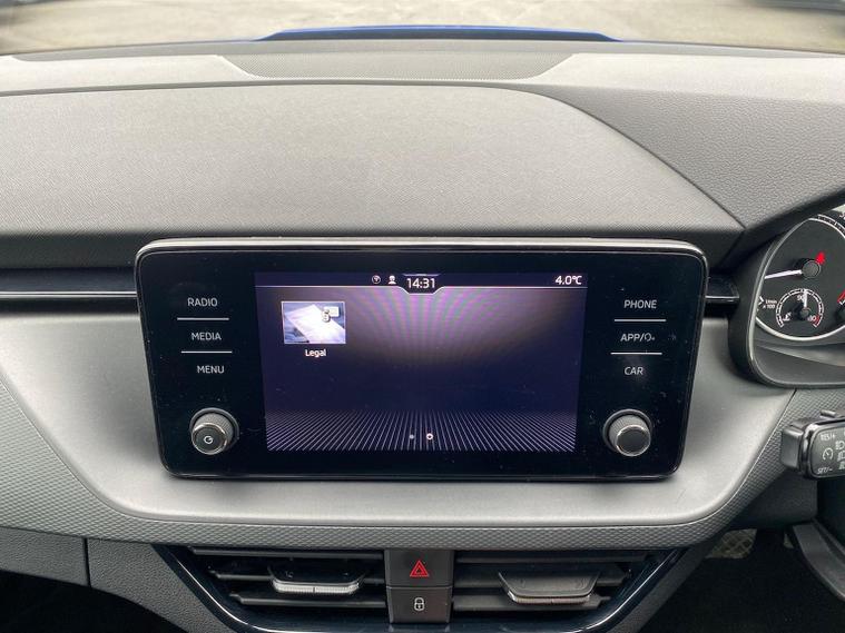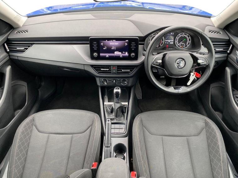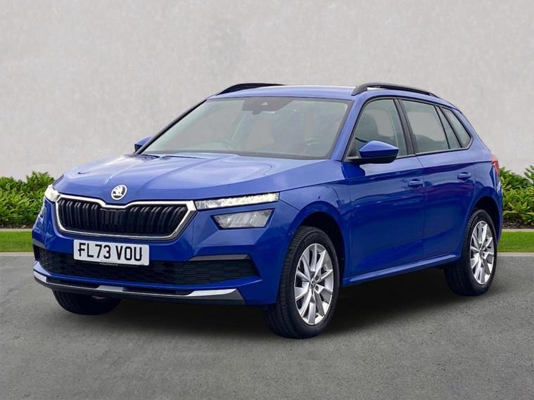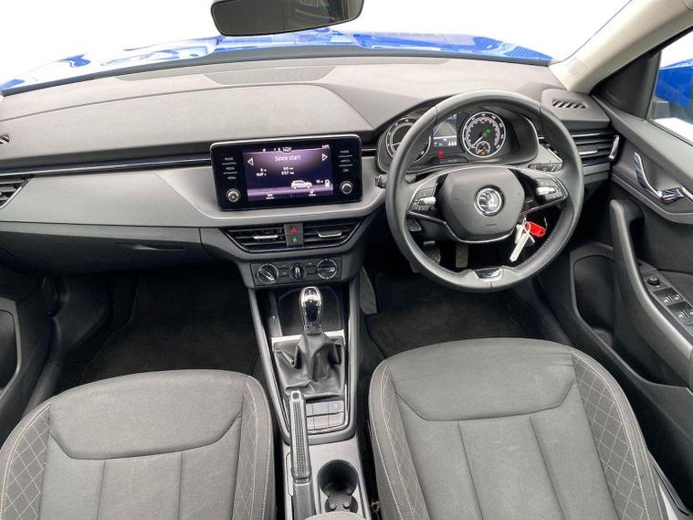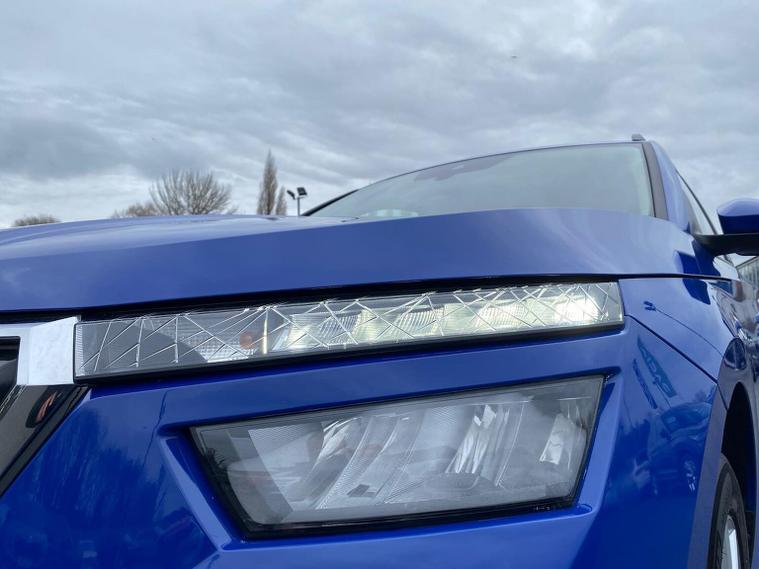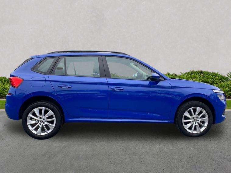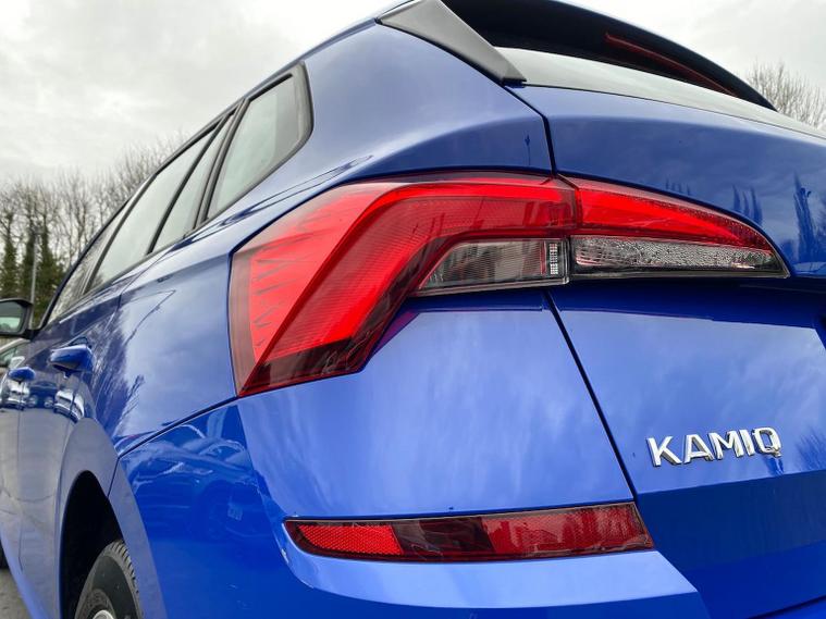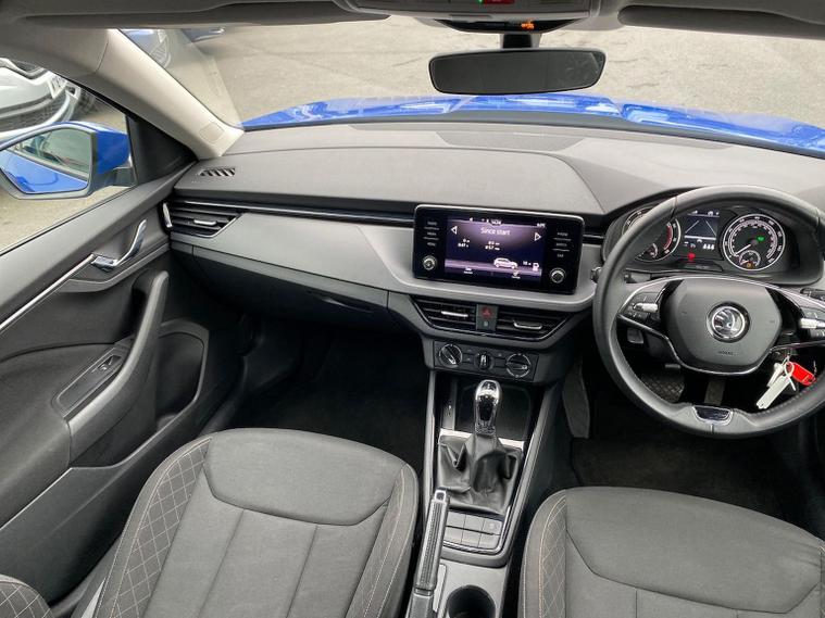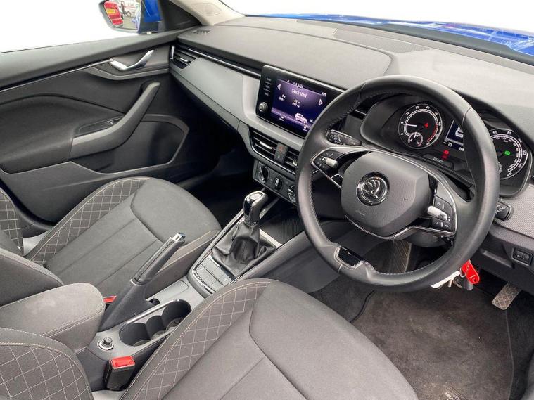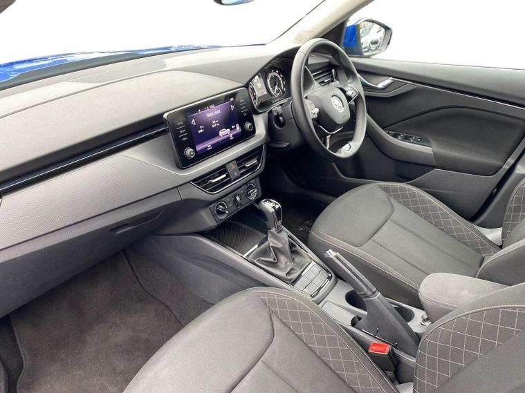 This Škoda Kamiq SE 1.0 TSI 110PS DSG in Energy Blue with a black interior and grey roof lining includes optional cooling shutters (S0M) and comes equipped with an 8" Bolero touchscreen, DAB radio, Bluetooth, wireless Smartlink, 8 speakers, USB-C ports, a 12V socket, cruise control, rear parking sensors, tyre pressure monitoring, Lane Assist, Front Assist, Hill Hold Control and a black and white trip computer. Exterior features include 17" Braga alloy wheels, black roof rails, electrically adjustable and heated door mirrors, body-coloured trim, chrome grille detailing, front and rear electric windows, heated rear screen, LED headlights, LED daytime running lights and LED rear lights. Inside it offers manual air conditioning, a height-adjustable driver’s seat with lumbar support, a leather multifunction steering wheel, front centre armrest, illuminated glovebox, reading lights front and rear, overhead glasses holder, sun visor illumination for the passenger, textile floor mats, a third rear headrest, and the umbrella and ice scraper. Safety equipment includes ABS, front, side and curtain airbags, passenger airbag deactivation, alarm with SAFE locking, ISOFIX on front passenger and outer rear seats with top tether, seatbelt reminders, electronic immobiliser and remote central locking with two keys. We offer in-person appointments, personal video appointments, test drives and finance options.