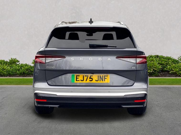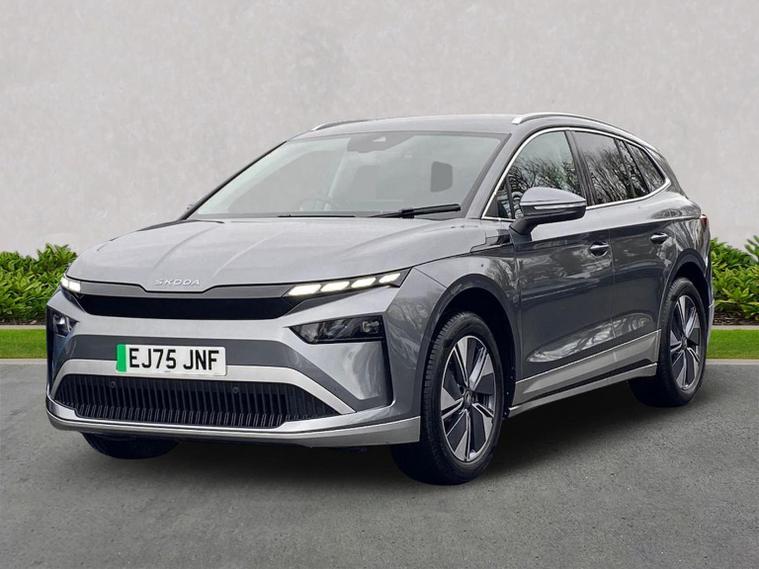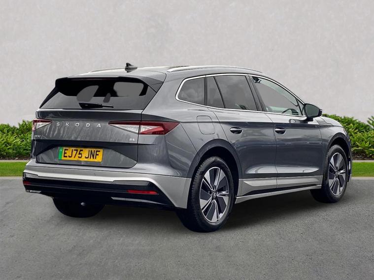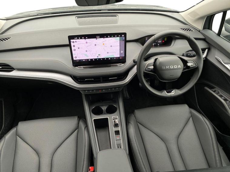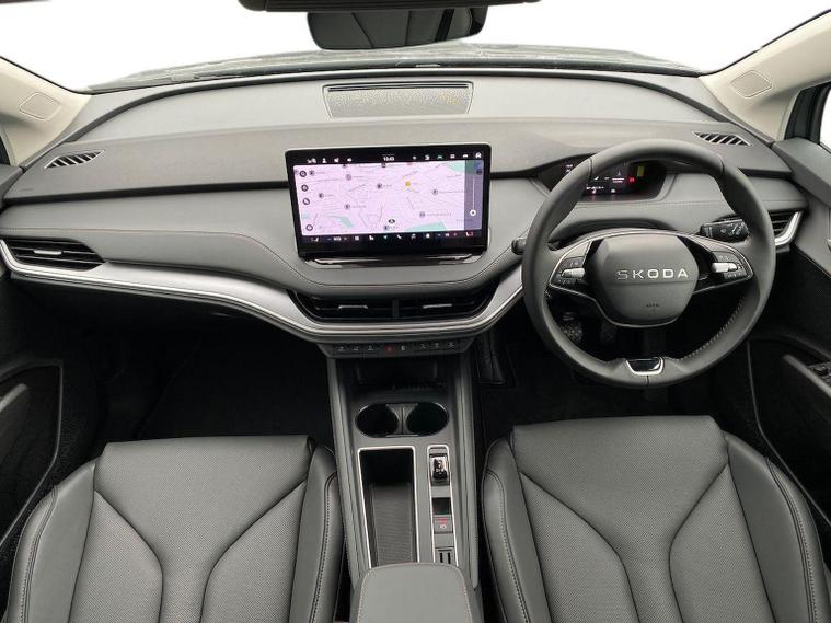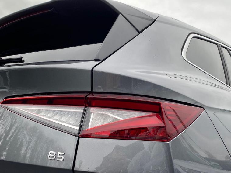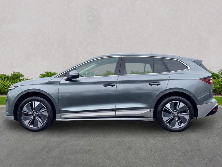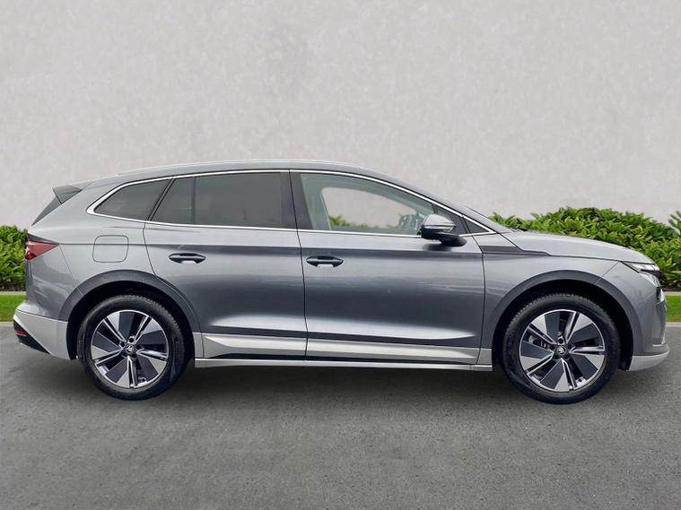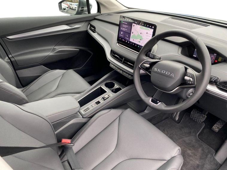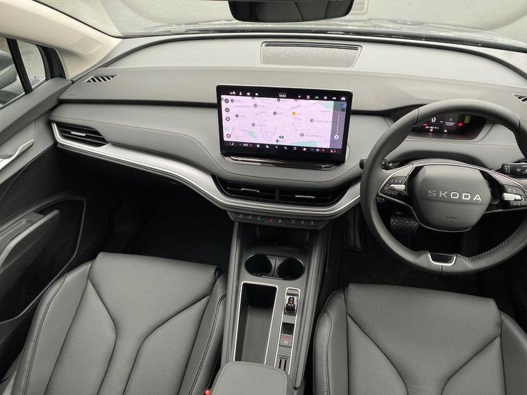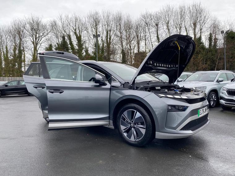 This Škoda Enyaq Edition 85 in Graphite Grey Metallic with the Suite Black interior includes the Suite Design Selection Package (PLB) which adds leather and artificial leather upholstery, LED ambient lighting, Diacut Cross decorative inserts, enhanced door and side trim, front and rear floor mats and footwell lighting. Standard equipment includes a 13" touchscreen with satellite navigation, DAB radio, Bluetooth, wireless Smartlink, wireless phone charging with cooling, USB-C ports in the front and rear, Wi-Fi hotspot capability, e-Call, towbar preparation and Skoda Connect services. Driver assistance features include Blind Spot Detection, Predictive Adaptive Cruise Control with Traffic Jam Assist, Drive Mode Select, front and rear parking sensors, rear view camera, Traffic Sign Recognition, Driver Alert, Voice Control and tyre pressure monitoring. Exterior features include 19" Regulus anthracite alloy wheels, heated, folding and auto-dimming mirrors with boarding spots and welcome logo, privacy glass with acoustic side windows, heat-insulating windscreen, dark chrome roof rails and window trim, rear spoiler and a tyre repair kit. Inside it offers heated front seats, tri-zone climate control, the two-spoke heated multifunction steering wheel, electrically operated tailgate with virtual pedal, sliding boot cover, LED ambient lighting, extended interior noise suppression, gesture control, boot lighting, a 5" digital cockpit and an umbrella. Safety equipment includes front, side, curtain and central interaction airbags, Crew Protect Assist, Front Assist with pedestrian and cyclist detection, Emergency Steering Support, ISOFIX mounts on the front passenger seat and outer rear seats with top tether, Anti-Theft alarm with interior monitoring and walk-away locking, Speed Assist and Travel Assist Plus. Charging features include the Mode 3 32A cable and up to 135kW DC rapid-charging capability. We offer in-person appointments, personal video appointments, test drives and finance options.